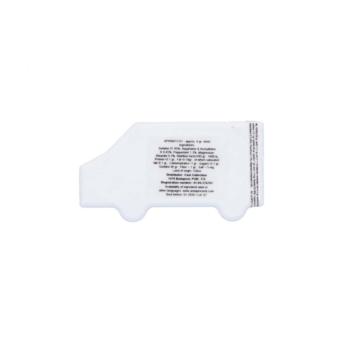 We wnętrzu pojazdu kryje się około 8 gramów odświeżających miętówek bez cukru, które błyskawicznie orzeźwiają oddech, a zgrabne opakowanie o wymiarach: 88×40×6 mm bez trudu zmieści się w kieszeni, schowku samochodowym lub torebce. Całość waży zaledwie waga: 14 g, co sprawia, że dozownik jest niezwykle lekki i praktyczny. Wykonanie z wytrzymałego materiał: plastik gwarantuje solidność, a neutralny kolory: biały stanowi perfekcyjne tło pod Twój firmowy nadruk lub logo. Dzięki dużej, płaskiej powierzchni ciężarówki projekt graficzny będzie wyeksponowany w pełnej krasie.