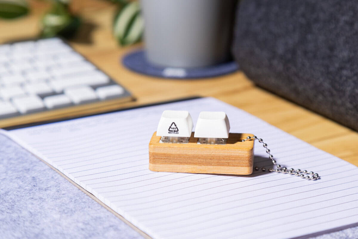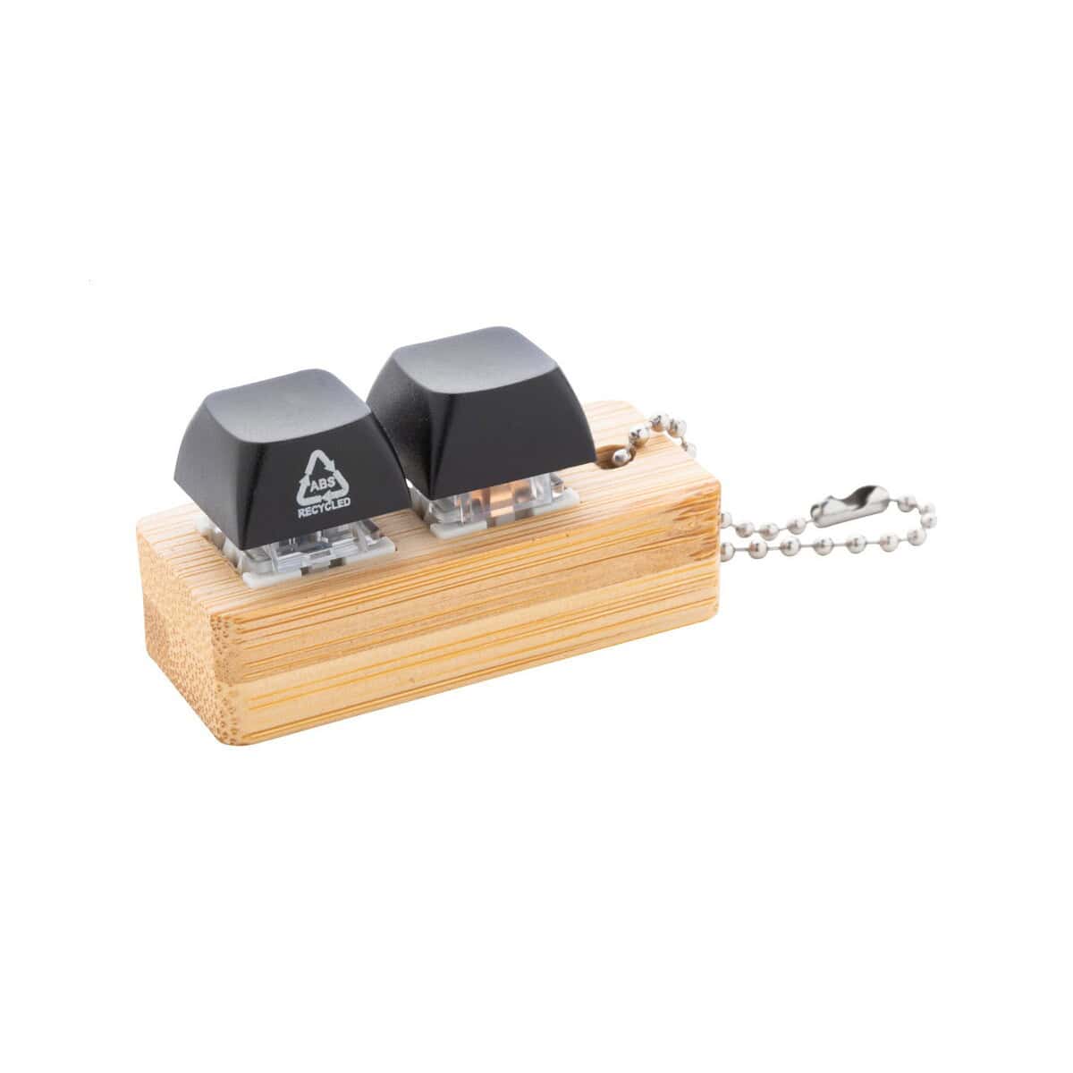 Dwa wypukłe, wyraźnie klikające przyciski imitujące klawiaturę mechaniczną dają kojące wrażenia sensoryczne, które pomagają rozładować napięcie w stresujących momentach. Dzięki gładkiej powierzchni bambusa produkt doskonale nadaje się na precyzyjny nadruk lub grawer, a subtelne kolory – czarny, biały i naturalny – umożliwiają pełną spójność z identyfikacją wizualną logo Twojej firmy. Tak przygotowany reklamowy drobiazg stanie się praktycznym i estetycznym dodatkiem do codziennych akcesoriów.