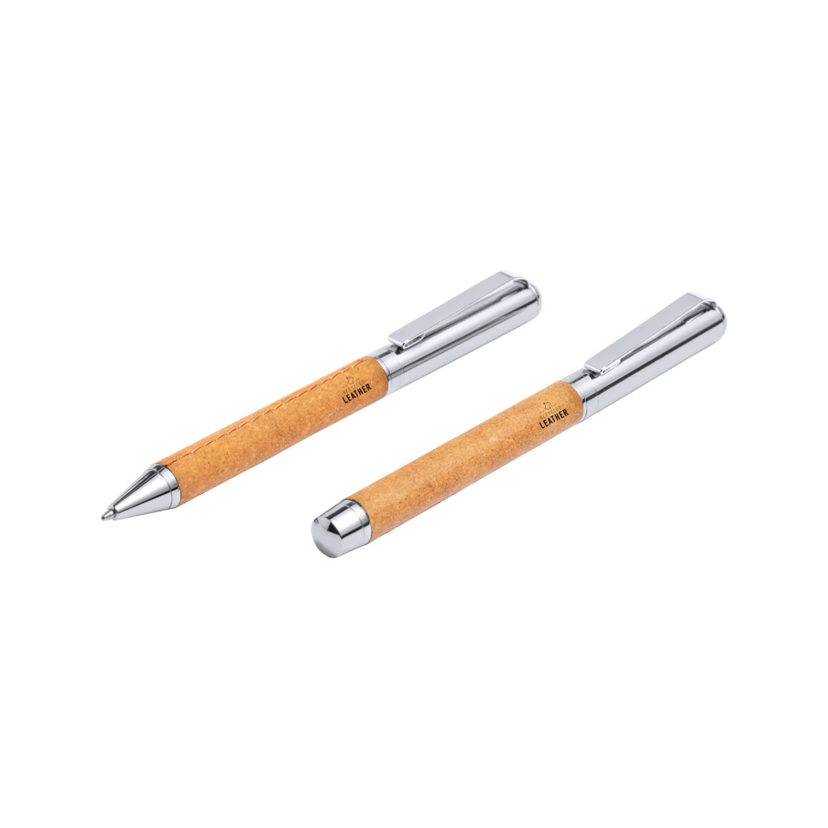 Pióro kulkowe z niebieskim wkładem wykonano z metalu i skóry z recyklingu. Metalowa obudowa sprawia, że artykuł jest nie tylko trwały, ale także elegancki i stylowy. Skóra wykorzystana w produkcji długopisu i pióra jest odpowiednio przygotowana i zabezpieczona przed zarysowaniem, dzięki czemu zachowuje swój naturalny wygląd przez wiele lat.