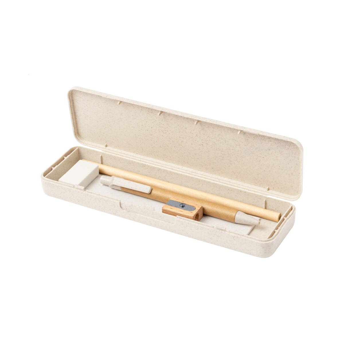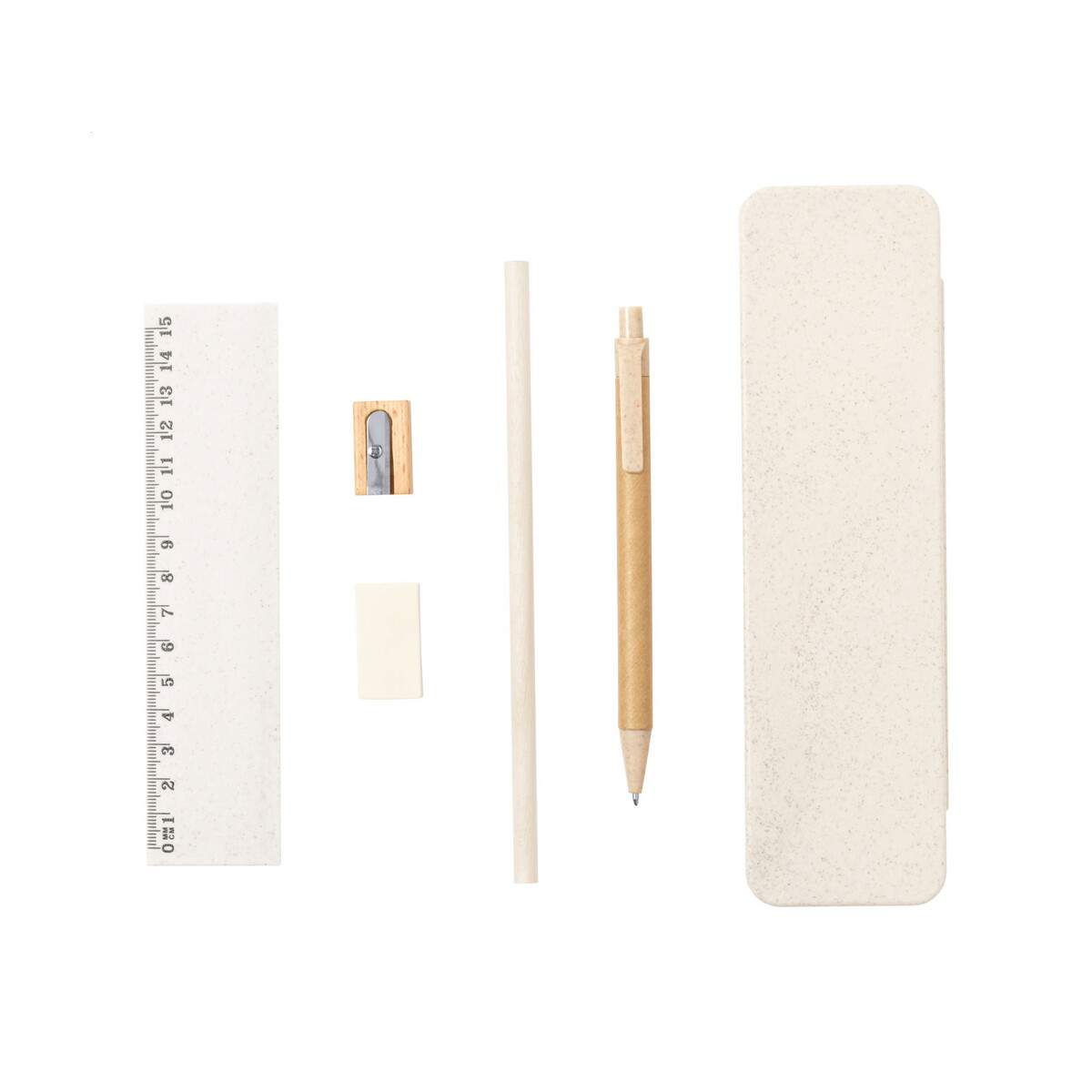 Weaston zestaw piśmienniczy to znakomite połączenie funkcjonalności i dbałości o środowisko, zamknięte w subtelnym, naturalnym designie. W ekologicznym pudełku z tworzywa ze słomy pszennej kryje się aż pięć starannie dobranych akcesoriów: drewniany ołówek, długopis z plastiku pochodzącego ze słomy pszennej z niebieskim wkładem, linijka 15 cm, temperówka z drewna oraz gumka. Całość waży zaledwie 80 g i mierzy 200 × 56 × 22 mm, co sprawia, że zestaw bez trudu zmieści się w torbie, plecaku czy szufladzie biurka 😊.