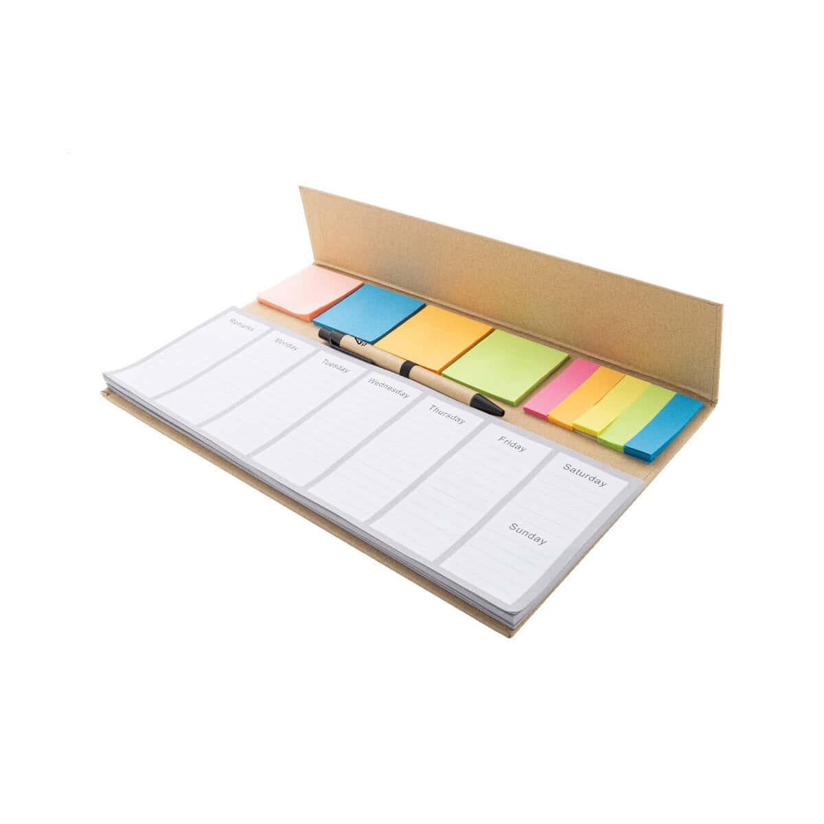 Zestaw kryje w sobie aż 50 arkuszy tygodniowego planera bez daty, które pozwalają rozpocząć planowanie w dowolnym momencie roku. Dodaj do tego 100 karteczek samoprzylepnych w 4 kolorach oraz 125 zakładek indeksujących w 5 barwach, a otrzymasz kompletny system organizacji zadań. Całość uzupełnia ekologiczny długopis z papieru z recyklingu z niebieskim wkładem – wystarczy wyjąć z pudełka i zacząć planować 📅. To znakomity sposób, by uporządkować projekty, terminy i ważne notatki w jednym miejscu.