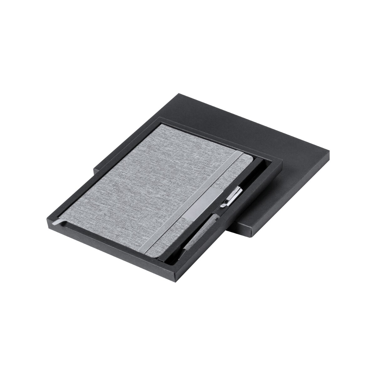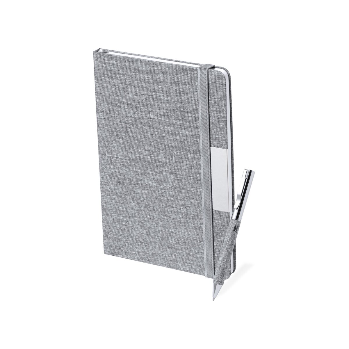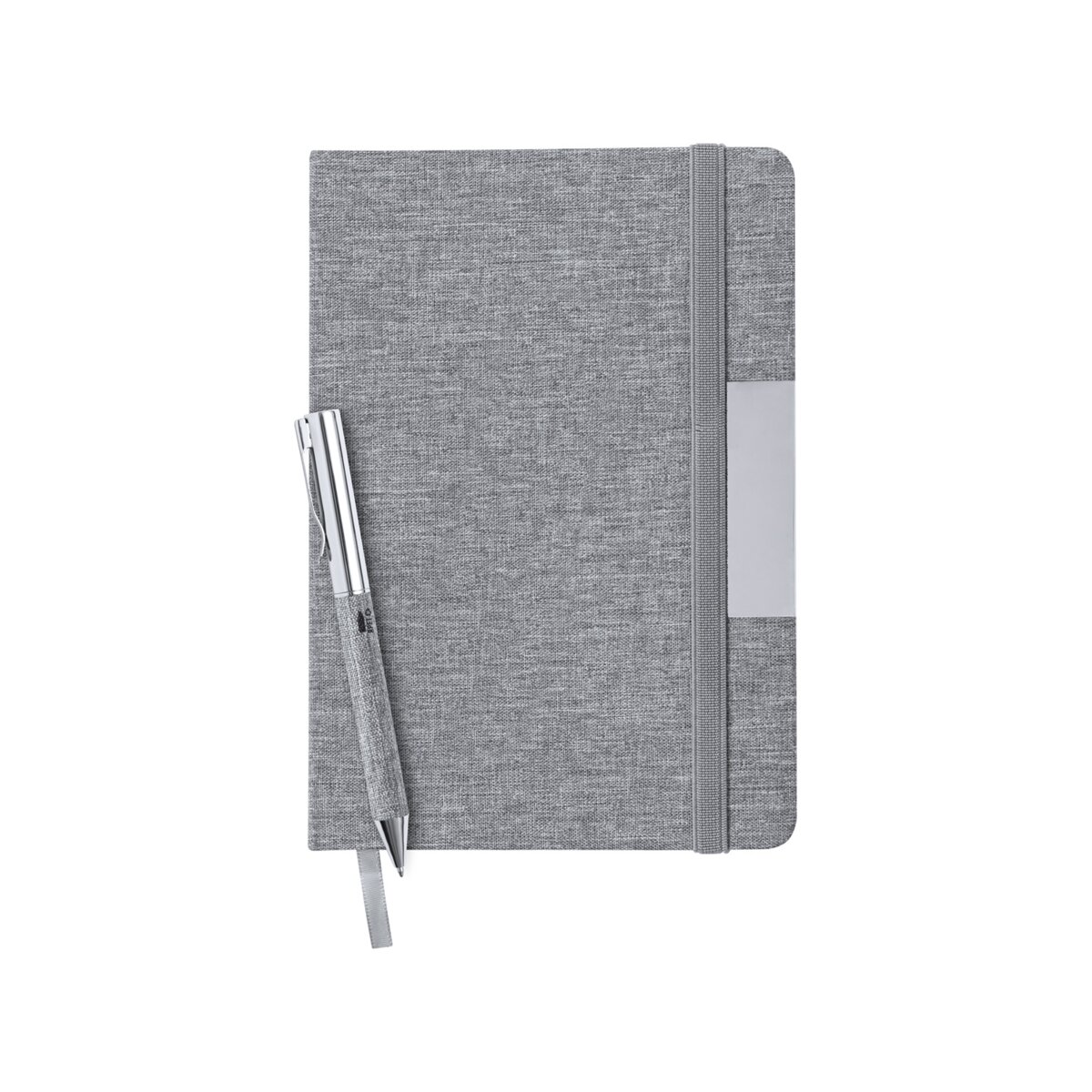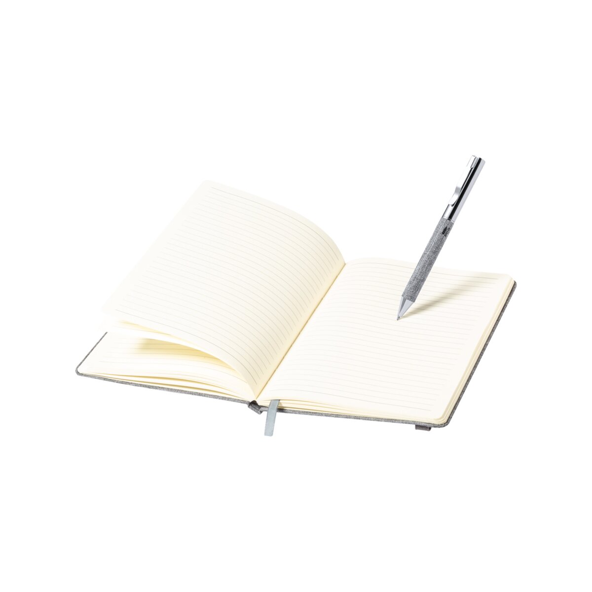Ten wyjątkowy notatnik to doskonałe narzędzie dla każdego, kto chce się organizować. Jego niezwykły design to połączenie stylowego poliestru 300D RPET z metalowym długopisem pokrytym poliestrem RPET i niebieskim wkładem. Notatnik w rozmiarze A5 ma wygodny gumowy pasek do zamykania i 100 kartek w linię, dzięki czemu z powodzeniem zastąpi Ci tradycyjny zeszyt.