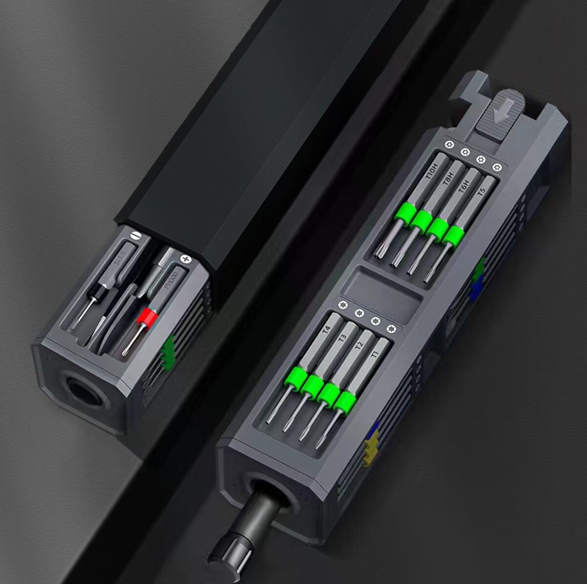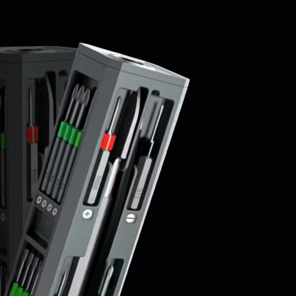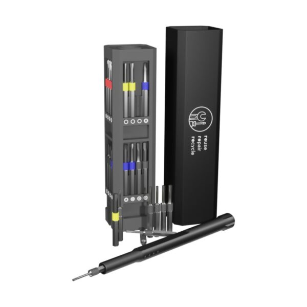 30-częściowy zestaw z precyzyjnym wkrętakim, 28 bitami i dwoma akcesoriami. Obudowę z oksydowanego aluminium (15 x 3,6 x 3,6 cm) można spersonalizować za pomocą grawerowanego logo. Kompaktowa obudowa ułatwia przechowywanie wszystkiego w jednym miejscu. Wkrętak ręczny doskonale nadaje się do naprawy każdego małego urządzenia, a dzięki swojemu kształtowi jest łatwy w zastosowaniu i obsłudze. Posiada szeroką gamę bitów, dzięki czemu jest uniwersalny dla wielu rodzajów zadań w zakresie majsterkowania. Każdy typ bitu jest oznaczony innym kolorem, aby można go było łatwo zidentyfikować. Bity są przyciągane magnetycznie do śrubokręta. W zestawie z pęsetą do zbierania małych przedmiotów i łomem do podnoszenia i otwierania obudów. Zapakowany w pudełko upominkowe (17 x 55 x 43,5 cm) z magnetycznym zamknięciem. 3-letnia gwarancja.