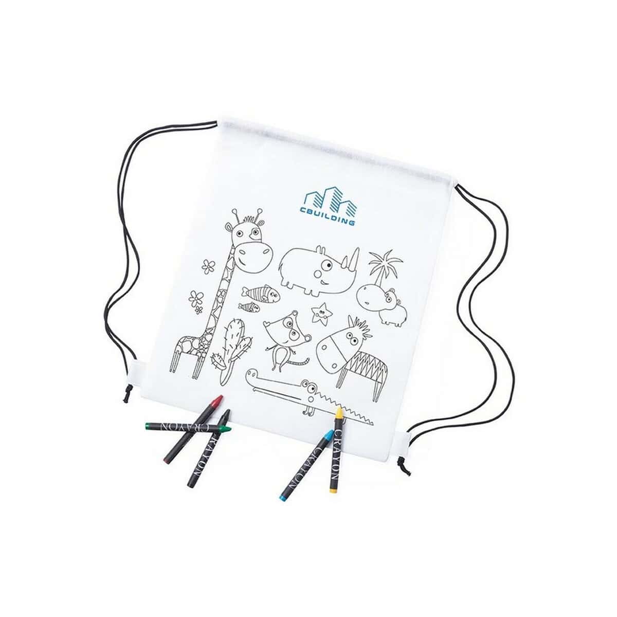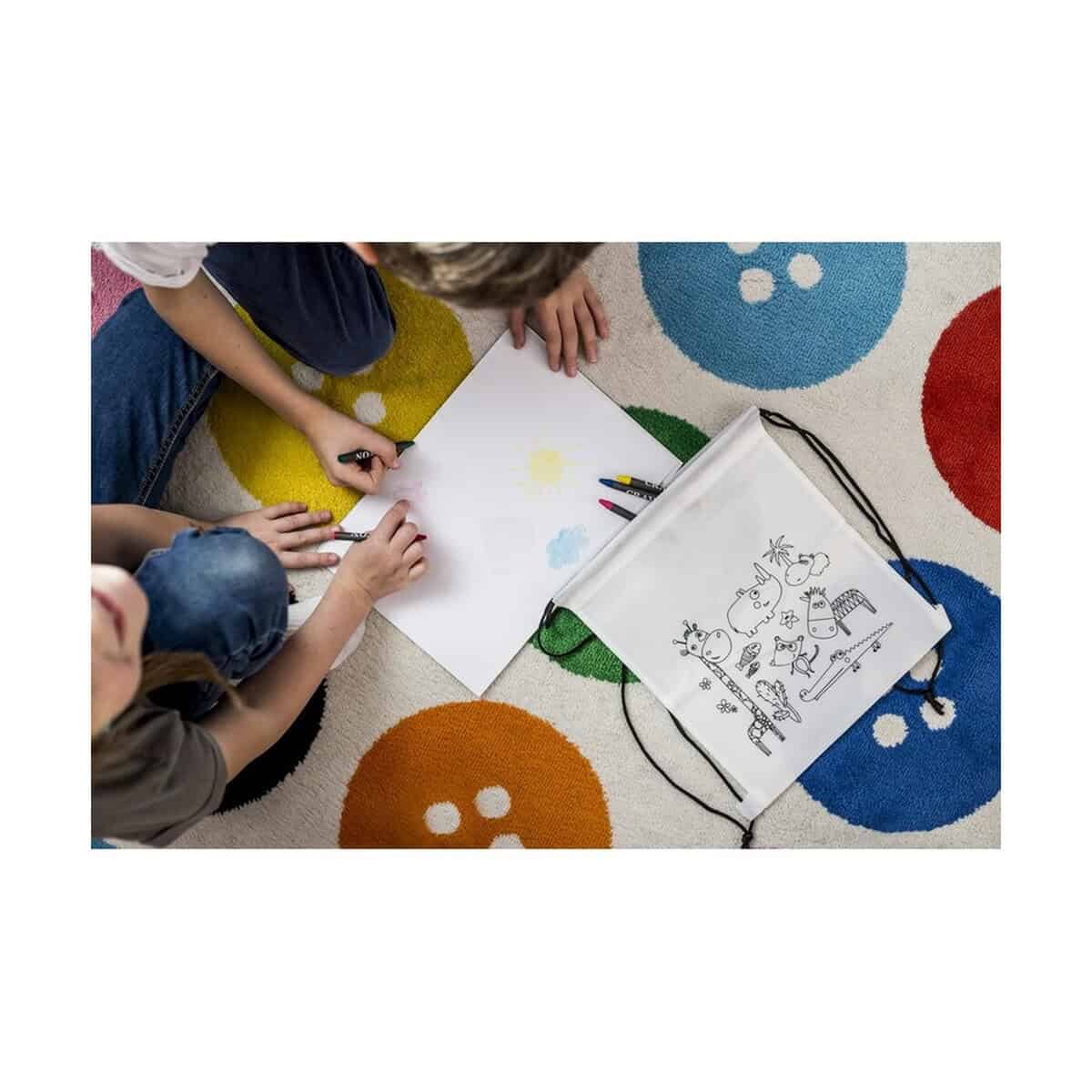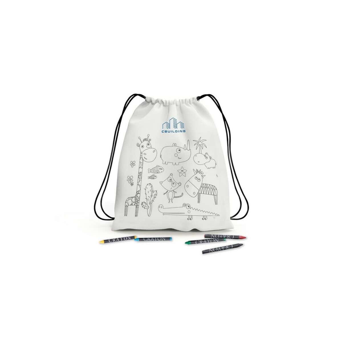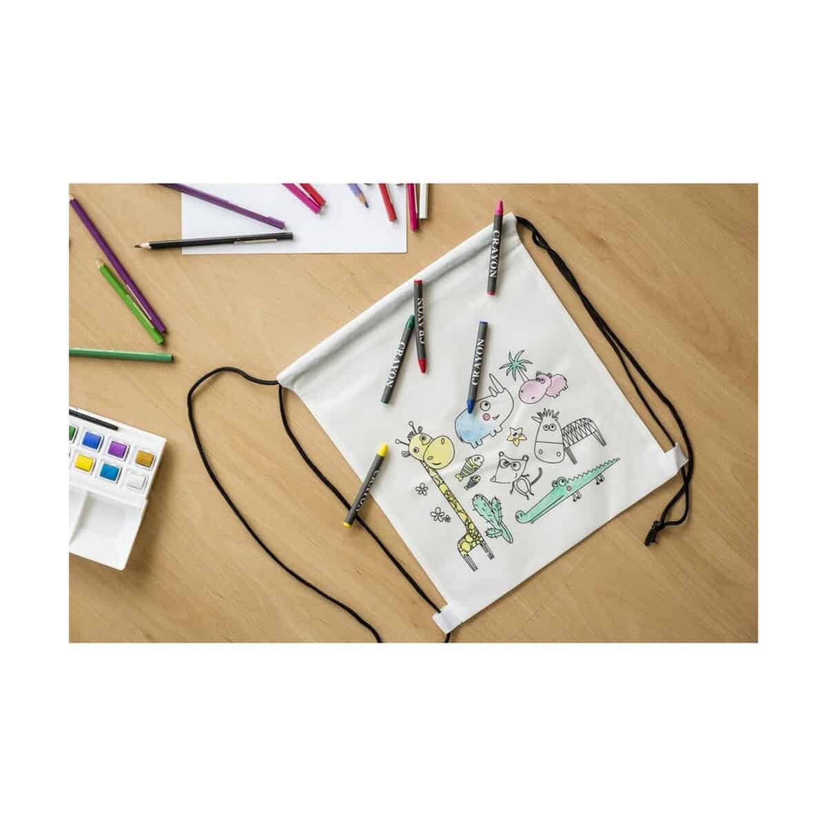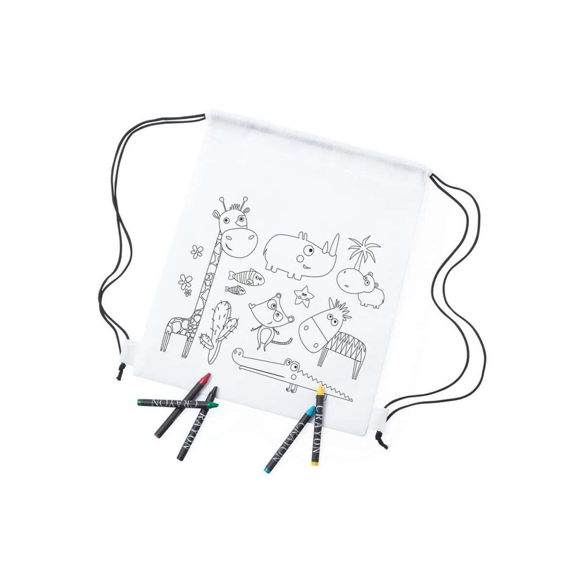 Worek ze sznurkiem do kolorowania, kredki | Rosemary to prawdziwie kreatywny gadżet, który łączy funkcję praktycznego plecaka ze świetną zabawą plastyczną. Na froncie znajduje się kolorowanka z uroczym motywem zwierząt, a w zestawie czeka komplet 5 kredek świecowych – wszystko, czego potrzeba, aby dziecko stworzyło własne, unikatowe dzieło sztuki. Worek wykonany został z wytrzymałego materiału non-woven 80 g/m² w klasycznym białym kolorze, dzięki czemu doskonale eksponuje każdy nadruk czy logo 🖍️. Niewielka waga – jedynie 35 g – oraz kompaktowe wymiary 25 × 30 cm sprawiają, że maluch może wygodnie nosić go na plecach podczas wycieczki, szkolnego pikniku lub wizyty u przyjaciół.