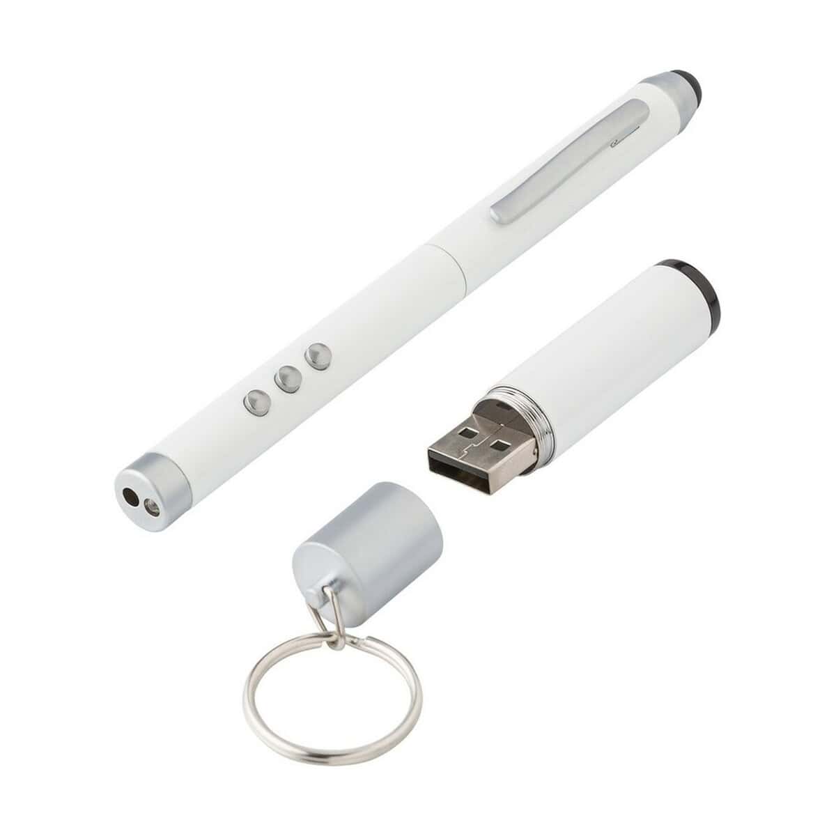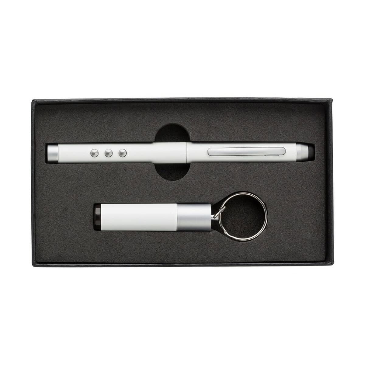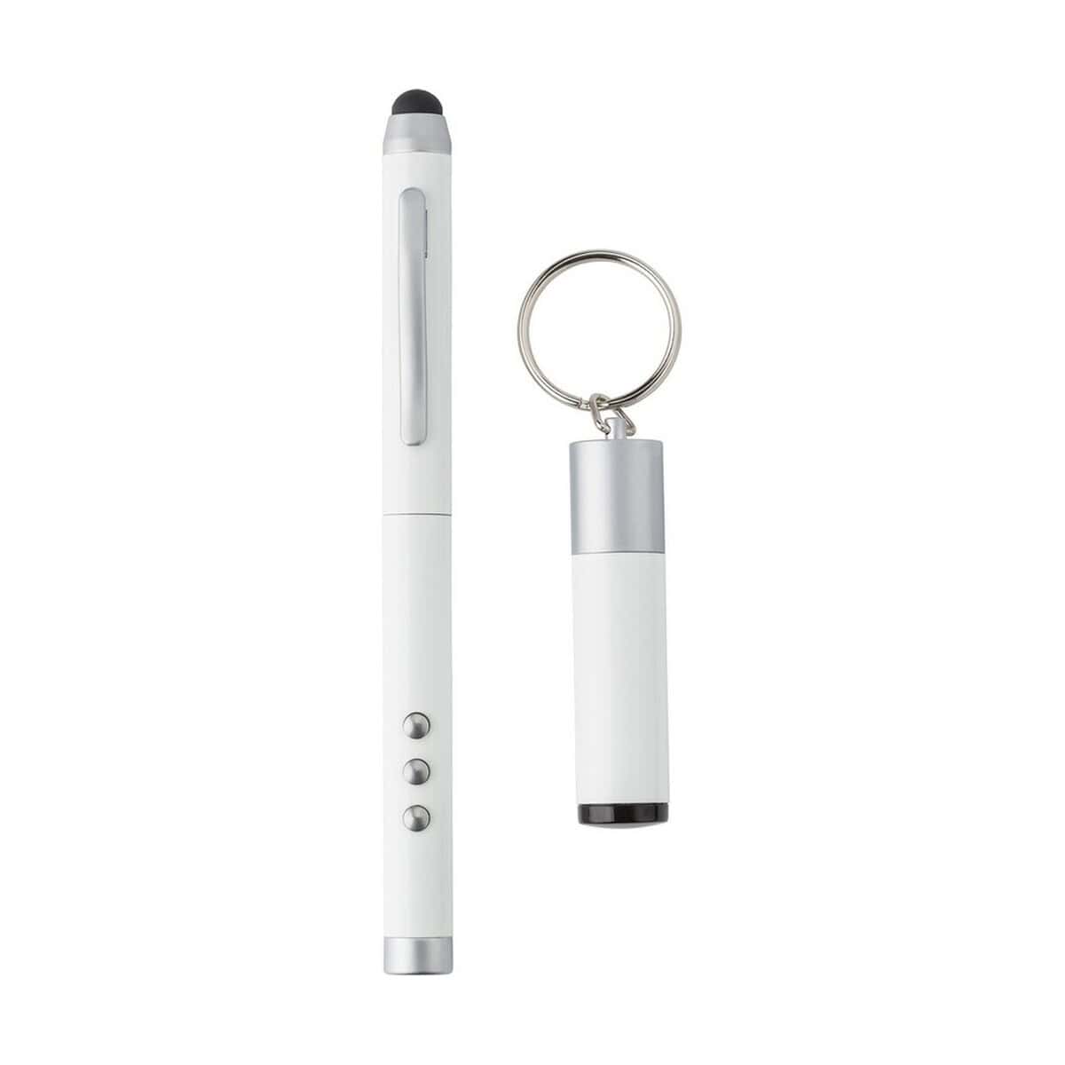 Zestaw charakteryzują wymiary: 15,6 × 8,7 × 2,5 cm oraz lekka waga 120 g, dzięki czemu bez trudu zmieści się w teczce, torbie konferencyjnej czy kieszeni marynarki. Do produkcji użyto wytrzymałych materiałów, takich jak materiał: ABS, metal i guma, a całość wykończono w uniwersalnym kolor: białym, który doskonale eksponuje każde logo. Ten bezkonkurencyjny zestaw jest wręcz perfekcyjny dla trenerów, wykładowców akademickich i menedżerów prowadzących liczne prezentacje, ale również studentów, którzy chcą profesjonalnie zaprezentować projekt przed komisją.