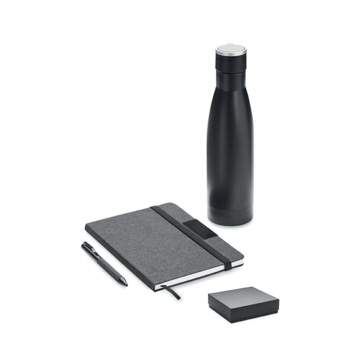 Do zestawu dołączony jest elegancki, przekręcany długopis, który doskonale komponuje się z całością koncepcji. Dodatkowo, butelka z podwójną ścianką izolowaną próżniowo, wykonana ze stali nierdzewnej, o pojemności 500 ml, utrzyma temperaturę Twojego napoju bez względu na warunki zewnętrzne.