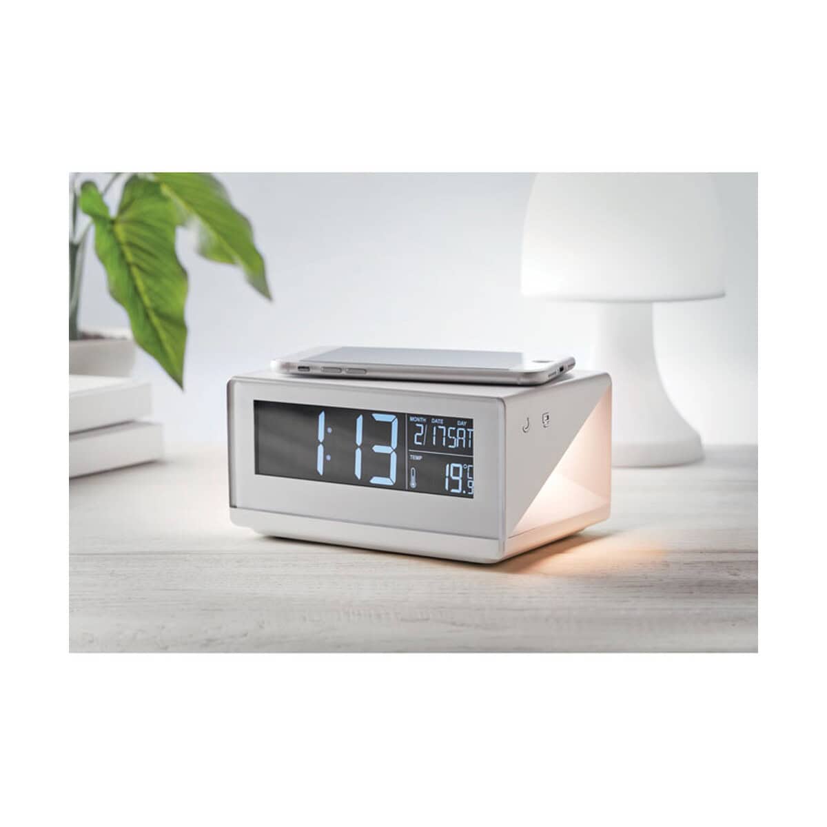 Zegar/bezprzewodowa ładowarka SKY WIRELESS to prawdziwie wielofunkcyjny gadżet, który łączy w sobie stację pogody, budzik, lampkę nocną i ładowarkę Qi. Dzięki temu stanowi doskonały nośnik reklamowy – szeroki front i górna powierzchnia czekają na Twój nadruk lub logo. Kompaktowe wymiary 15,5 × 10,5 × 8 cm, waga 570 g oraz trwała obudowa z ABS sprawiają, że urządzenie znakomicie sprawdza się zarówno na biurku, jak i na stoliku nocnym 🙂.