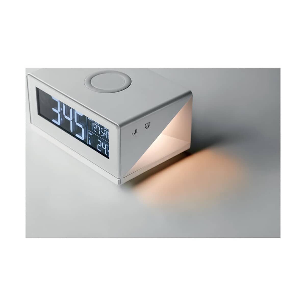 Bezpieczne wyjście DC 5 V / 1,0 A umożliwia wygodne ładowanie smartfonów Android oraz iPhone® 8, 8 S, X i nowszych. Funkcja stacji pogodowej pokazuje temperaturę, wilgotność i prognozę 🌦️, a przyjazna dla oczu lampka LED tworzy nastrojowe oświetlenie. Zintegrowany budzik z drzemką pomoże punktualnie rozpocząć dzień, co czyni urządzenie znakomitym prezentem firmowym.
