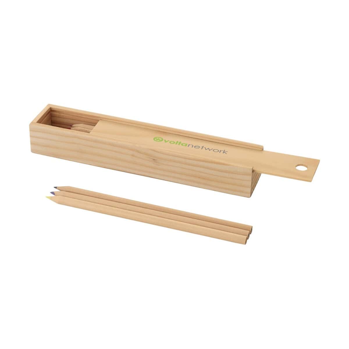 Wymiary zestawu to 21,5 × 3,5 × 4 cm, a jego waga wynosi zaledwie 121 g, dzięki czemu łatwo zmieści się w torbie konferencyjnej lub paczce wysyłkowej. Pudełko oraz kredki wykonane są z drewna, co podkreśla ich ekologiczny charakter i czyni je przyjaznym wyborem dla Twojej firmy, stawiającej na zrównoważony rozwój. Kolor obudowy – piasek pustyni – pasuje do każdego wnętrza i pozwala wyeksponować barwną zawartość.