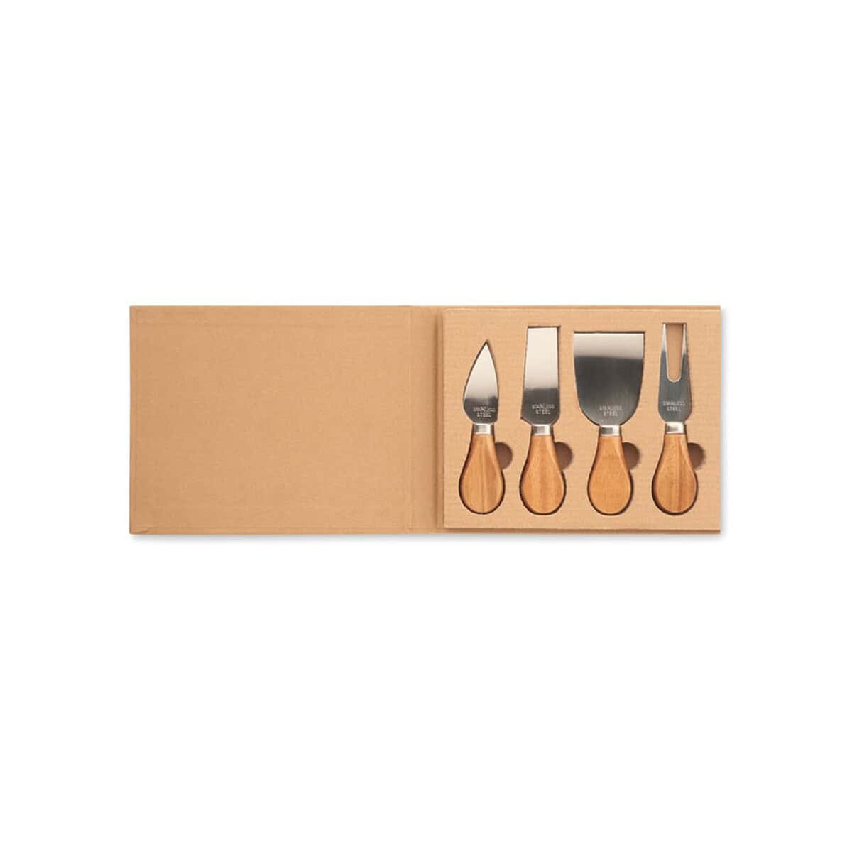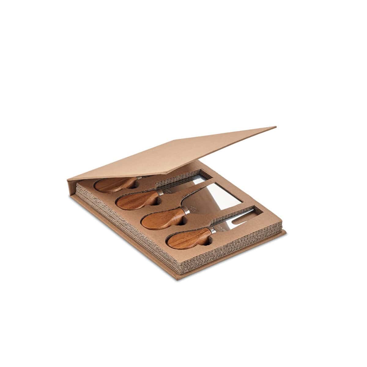 Zestaw 4 noży do sera QUATTRO to wyrafinowany i jednocześnie praktyczny gadżet kulinarny, który przyciąga uwagę stylistyką oraz funkcjonalnością. Cztery różnorodne ostrza ze stali nierdzewnej pozwalają z łatwością porcjować zarówno miękkie brie, jak i twardy parmezan, a ergonomiczne uchwyty z naturalnego drewna kauczukowego zapewniają pewny chwyt i przyjemne wrażenia dotykowe. Całość mieści się w estetycznym pudełku z falistej tektury, które doskonale chroni zawartość podczas transportu i prezentuje produkt w pełnej okazałości – wystarczy dodać logo, aby stworzyć niebanalny prezent firmowy 🙂