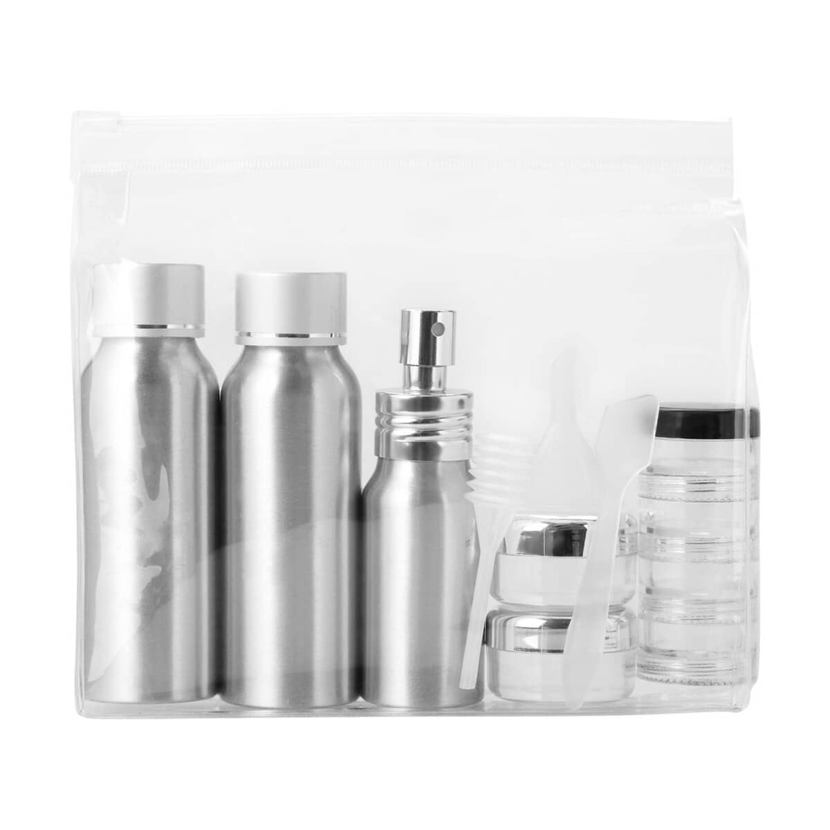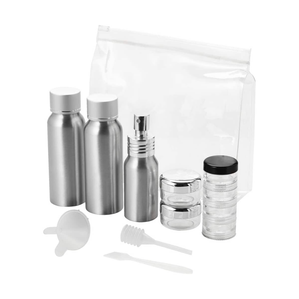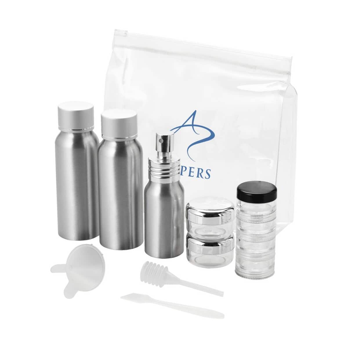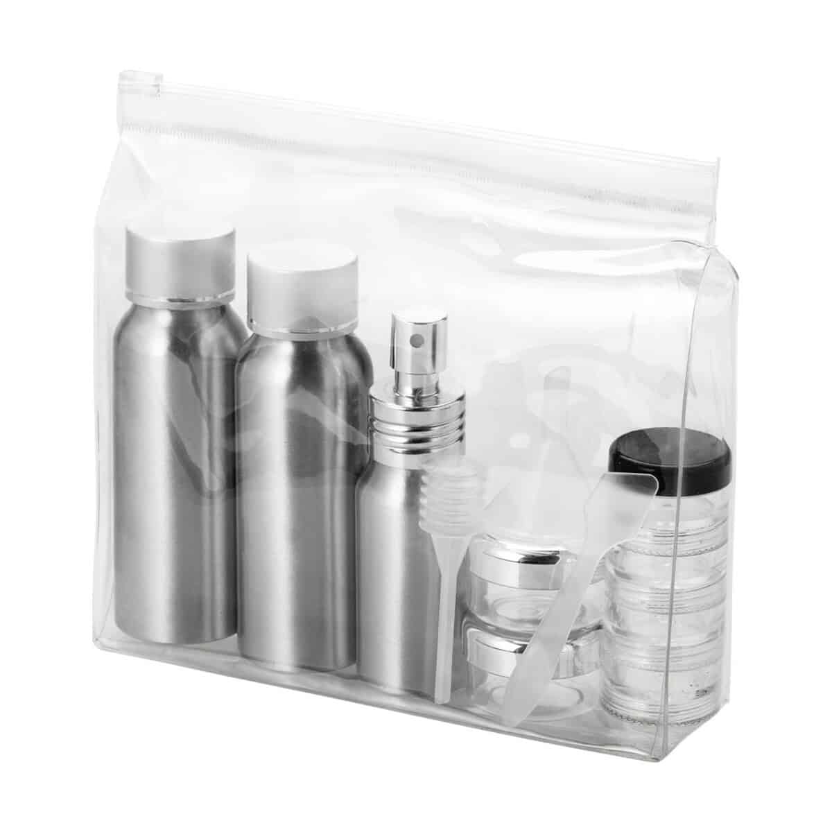 Zestaw butelek aluminiowych do samolotu Frankfurt to kompaktowy, a zarazem niezwykle funkcjonalny gadżet, który zachwyci klientów ceniących wygodę podróżowania. W solidnym etui z materiału PVC umieszczono dwie aluminiowe buteleczki o pojemności 80 ml, jedną buteleczkę z atomizerem, dwa słoiczki 14 ml, poręczny, czterowarstwowy słoiczek, a także lejek, szpatułkę i ssawkę. Wszystkie elementy są zapakowane oddzielnie od etui, co ułatwia utrzymanie higieny i porządku ✈️.
