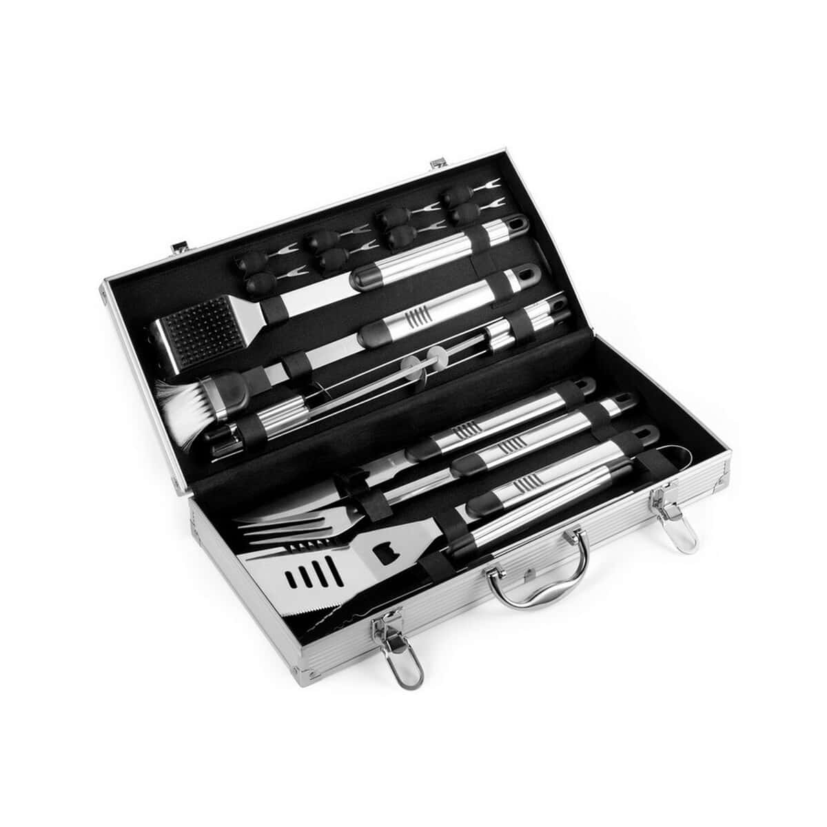 Zestaw do grilla to ekskluzywny gadżet, który przeniesie każdą plenerową ucztę na wyższy poziom smaku i wygody. Zamknięty w eleganckiej, aluminiowej walizce zestaw łączy w sobie funkcjonalność i prestiż, dzięki czemu stanie się niezastąpionym towarzyszem pikników, eventów promocyjnych oraz rodzinnych spotkań. W komplecie znajdziesz aż 8 widelczyków, 4 szpikulce, pędzel do marynat, nóż do krojenia mięsa, widelec do mięsa, łopatkę, dodatkowy nóż oraz solidne szczypce – wszystko, czego potrzebujesz, aby podać potrawy niczym mistrz grilla 🙂