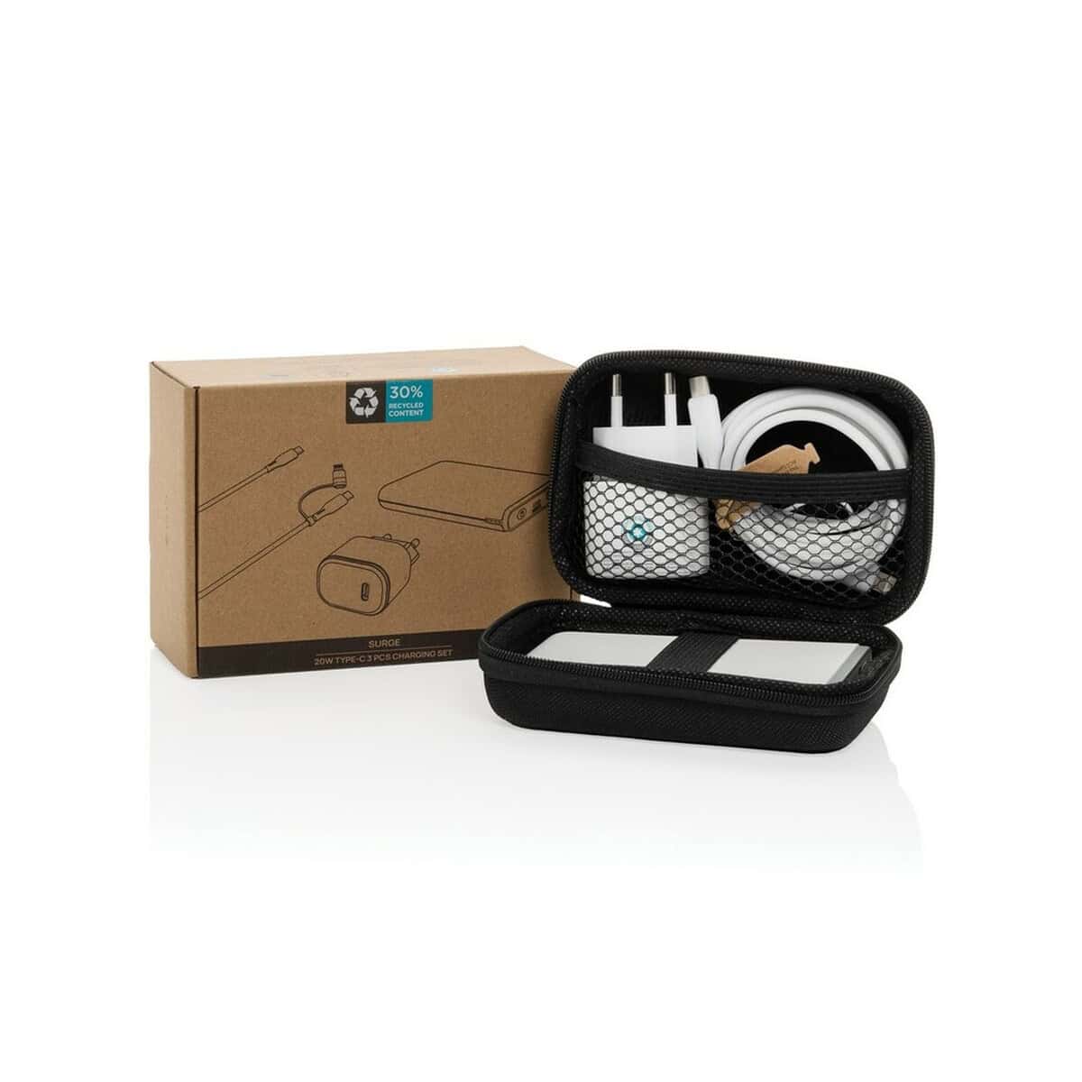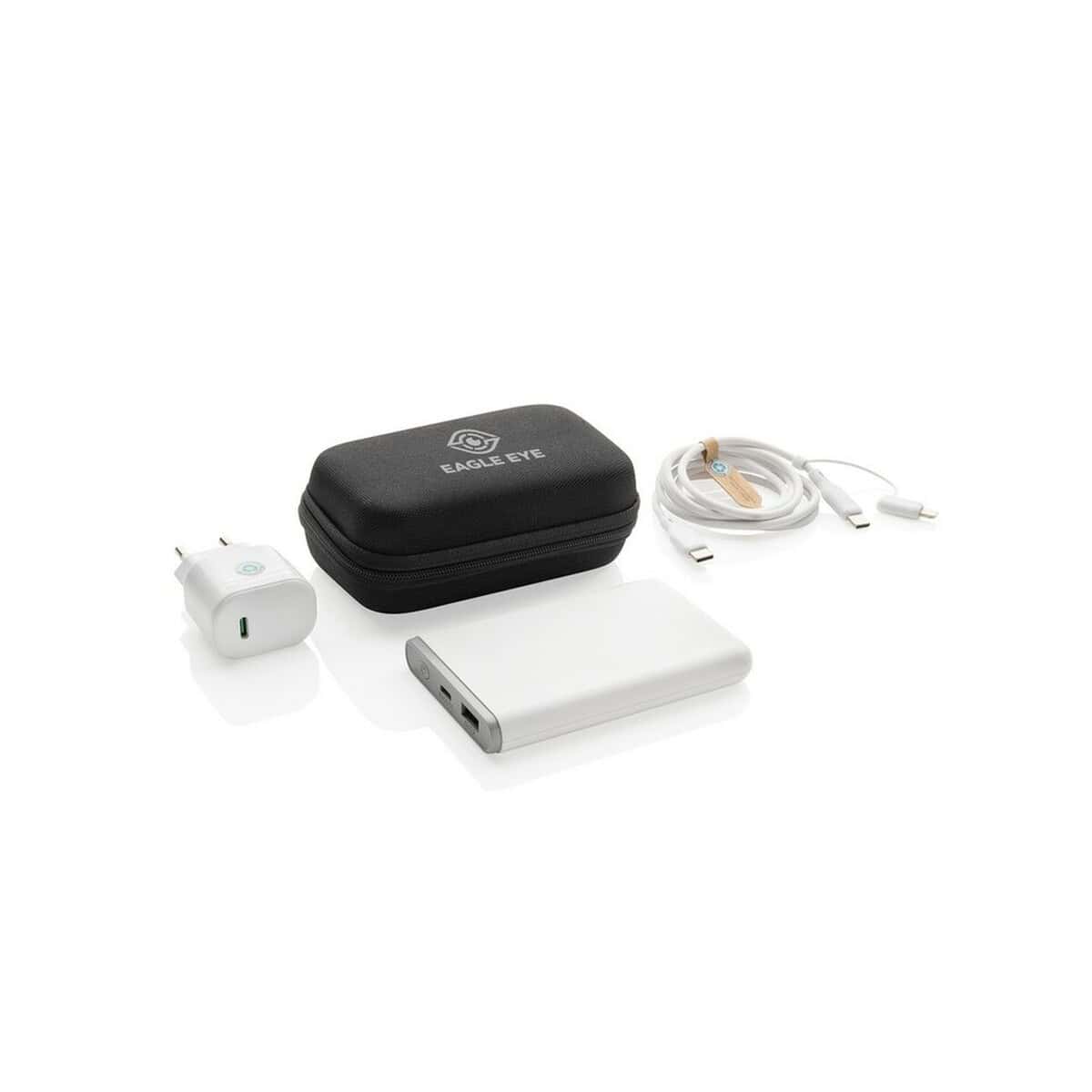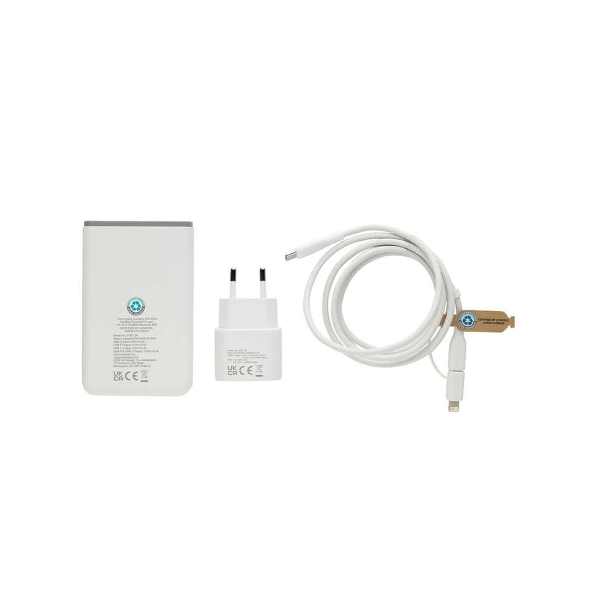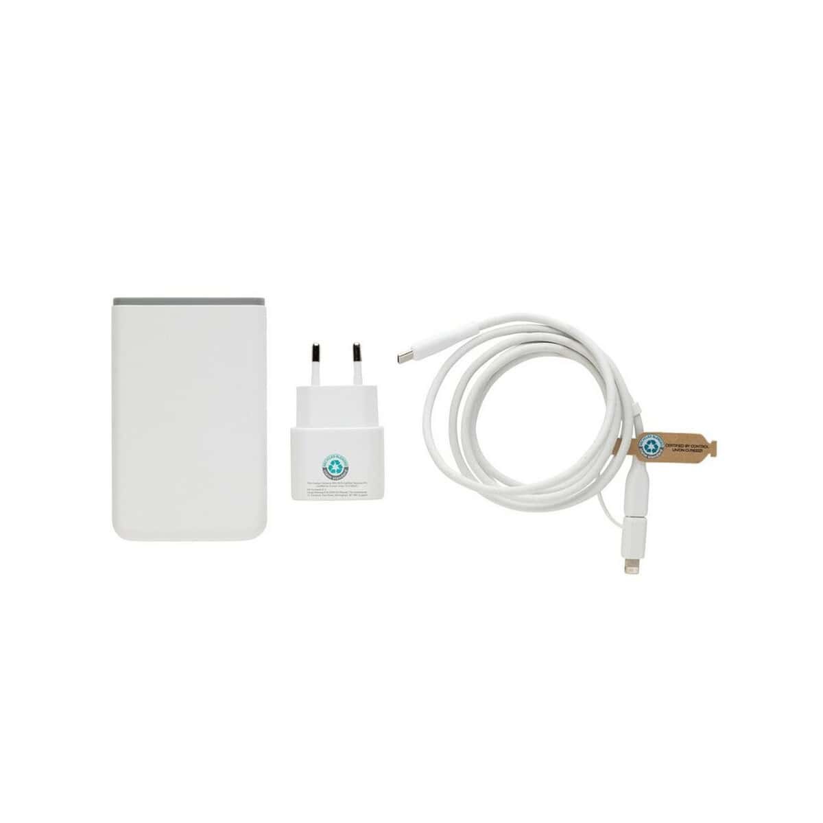 Zestaw do ładowania 20W Boost, 3 w 1 to prawdziwie wszechstronny gadżet, który natychmiast wyróżni się jako efektowny nośnik firmowego logo 😊. W kompaktowym etui RPET znajdziesz ścienną ładowarkę USB-C o mocy 20W, powerbank 5000 mAh oraz kabel 3 w 1 (2×USB-C + iOS) o przepustowości 60W. Obudowy z materiałów z recyklingu (aż 59 % całkowitej wagi) podkreślają proekologiczny charakter produktu i sprawiają, że jest on doskonałym nośnikiem świadomego przekazu reklamowego. Komplet waży zaledwie 248,7 g i mieści się w kieszeni kurtki – towarzyszy wszędzie tam, gdzie liczy się szybkie zasilanie 🔋.