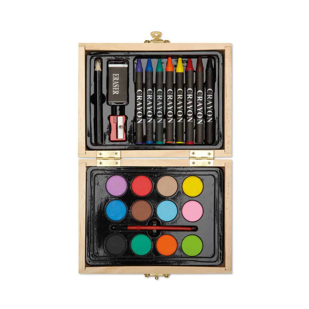 Zestaw do malowania. BEAU to niezwykle pomysłowy gadżet, który zachwyci zarówno małych artystów, jak i dorosłych poszukujących chwili twórczego wytchnienia. Kompaktowe drewniane etui o naturalnym wykończeniu mieści wszystko, czego potrzebujesz, aby dać upust wyobraźni: 8 kredek, 12 farbek akwarelowych, pędzelek, temperówkę, gumkę oraz ołówek. Dzięki eleganckiej, ekologicznej obudowie produkt doskonale podkreśli charakter Twojej marki, gdy ozdobisz go własnym logo 🎨.