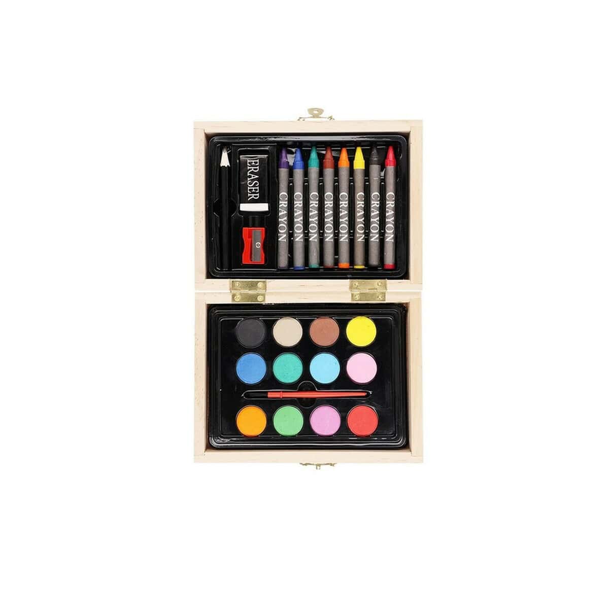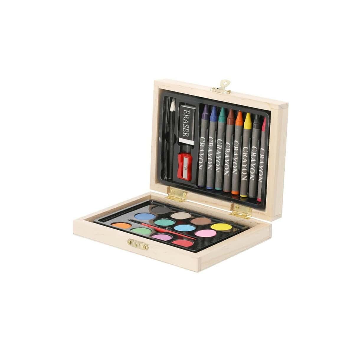 Zestaw do malowania i rysowania, 24 el., kredki, ołówek, gumka do mazania, temperówka, farbki akwarelowye, pędzelek, drewniane pudełko