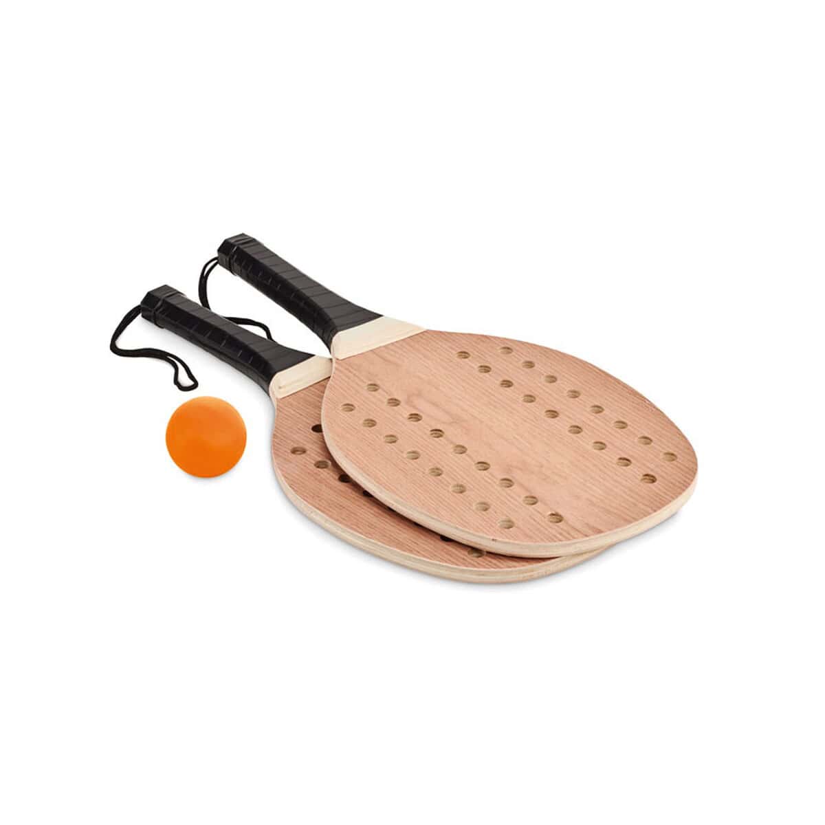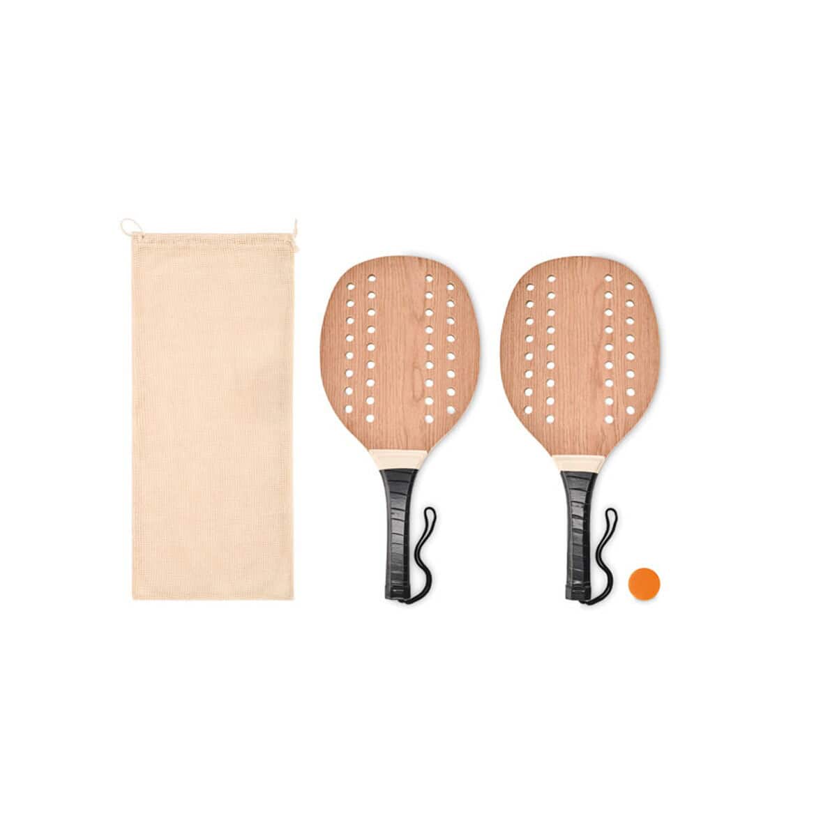 Zestaw do tenisa plażowego PALAS to prawdziwie wakacyjny gadżet, który przeniesie atmosferę beztroskiej zabawy na każdą firmową imprezę pod chmurką 😊. Składa się z dwóch solidnych rakiet wykonanych z dopracowanego drewna różanego z uchwytem wykończonym taśmą PU, a także z jednej miękkiej piłki – wszystko to mieści się w praktycznym, bawełnianym etui. Zestaw do tenisa plażowego PALAS jest nie tylko atrakcyjny wizualnie, lecz również doskonały do personalizacji: na rączkach lub na etui można umieścić wyraziste logo albo trwały nadruk, który podkreśli charakter Twojej marki. Ten produkt sprawdzi się jako dynamiczny nośnik przekazu reklamowego, przyciągając wzrok i gwarantując dobrą zabawę każdemu odbiorcy 🎯.