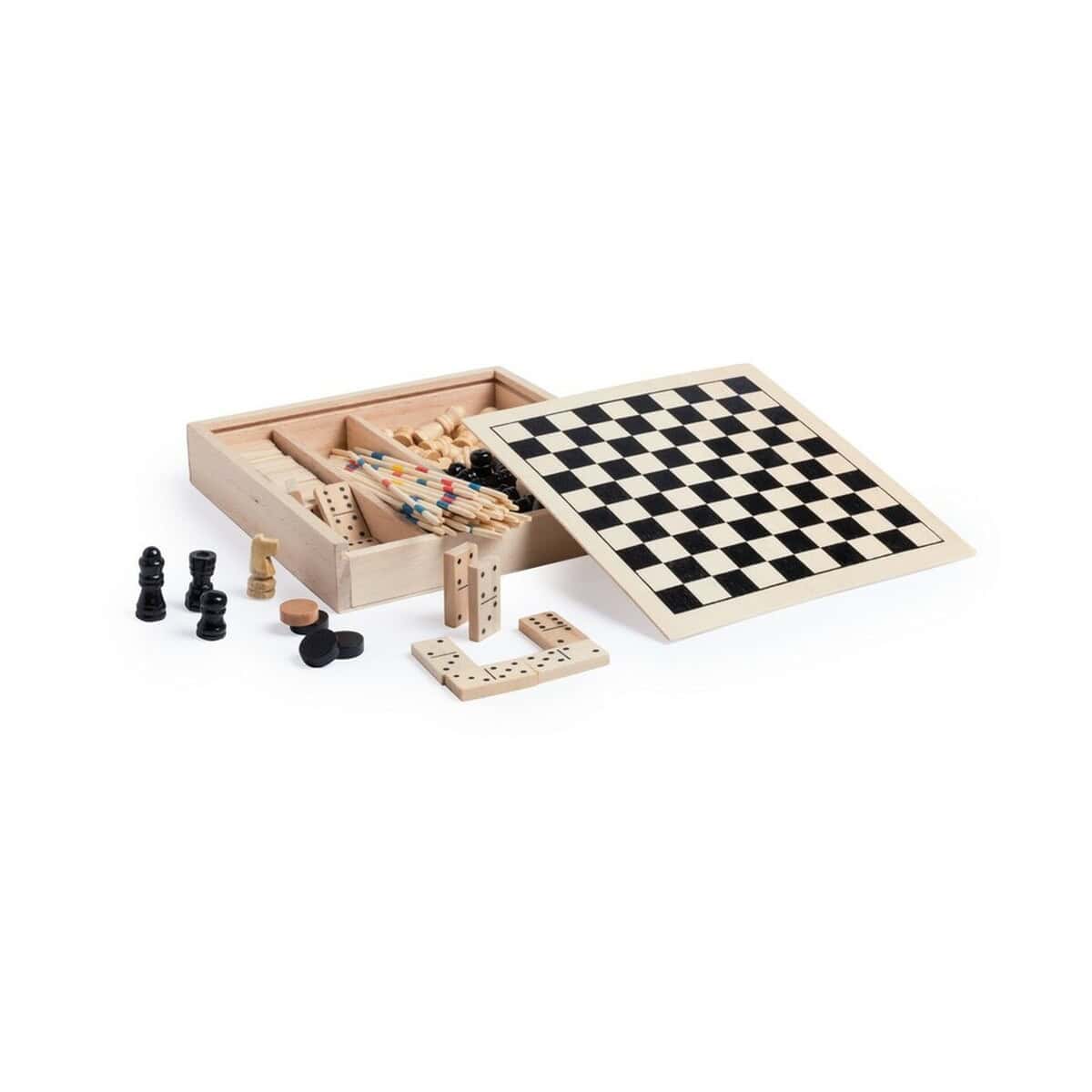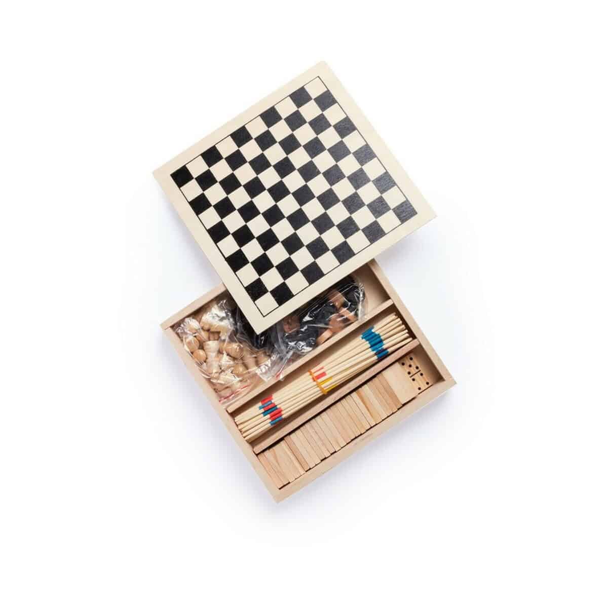 Zestaw gier to wszechstronny, a zarazem elegancki gadżet promocyjny, który wprowadzi nutę rywalizacji oraz relaksu do każdego biura, hotelu czy strefy chill-out na eventach 🙂. W stylowym, wykonanym z naturalnego materiału: drewno pudełku o wymiarach 16,3 x 3 x 16,3 cm kryją się cztery ponadczasowe klasyki: szachy, warcaby, domino i mikado. Dzięki temu jedno kompaktowe opakowanie zapewnia rozrywkę na wiele godzin, niezależnie od wieku uczestników.