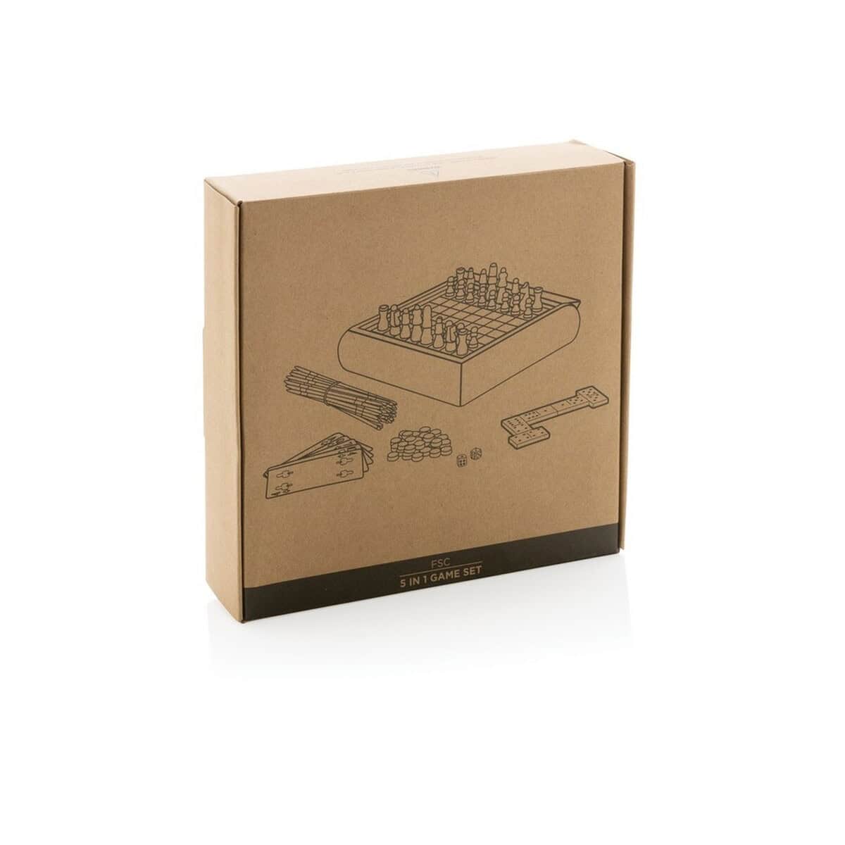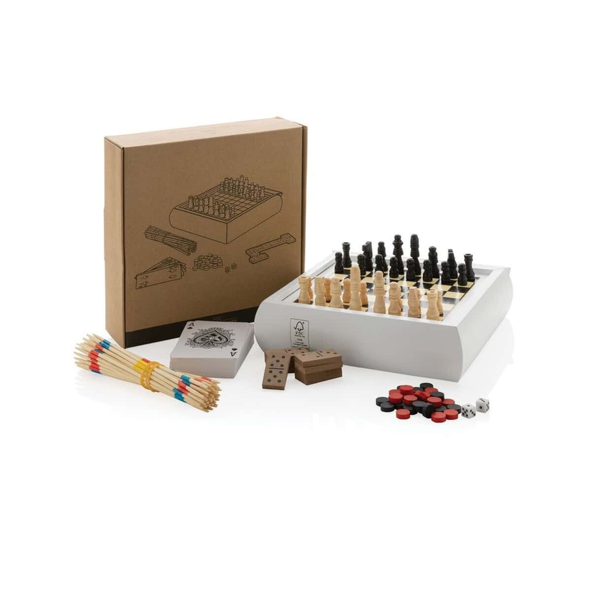 Zestaw gier 5 w 1 to prawdziwa perełka w kategorii Gry z logo oraz Gry plażowe z logo. W eleganckim pudełku z papieru kraftowego z certyfikatem FSC® kryją się klasyki: mikado, karty do gry, domino, szachy i tryktrak. Całość wykonano z naturalnego drewna, również z certyfikatem FSC®, co podkreśla ekologiczny charakter produktu i niski ślad węglowy – zaledwie 1,65 kg CO₂. Dzięki kompaktowym wymiarom 18,4 × 18,4 × 4,5 cm oraz neutralnej, białej kolorystyce, zestaw jest nie tylko estetyczny, ale i wytrzymały 🙂