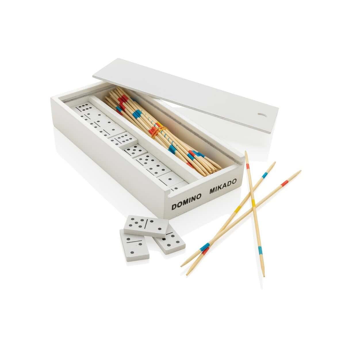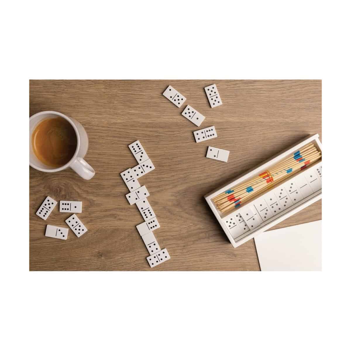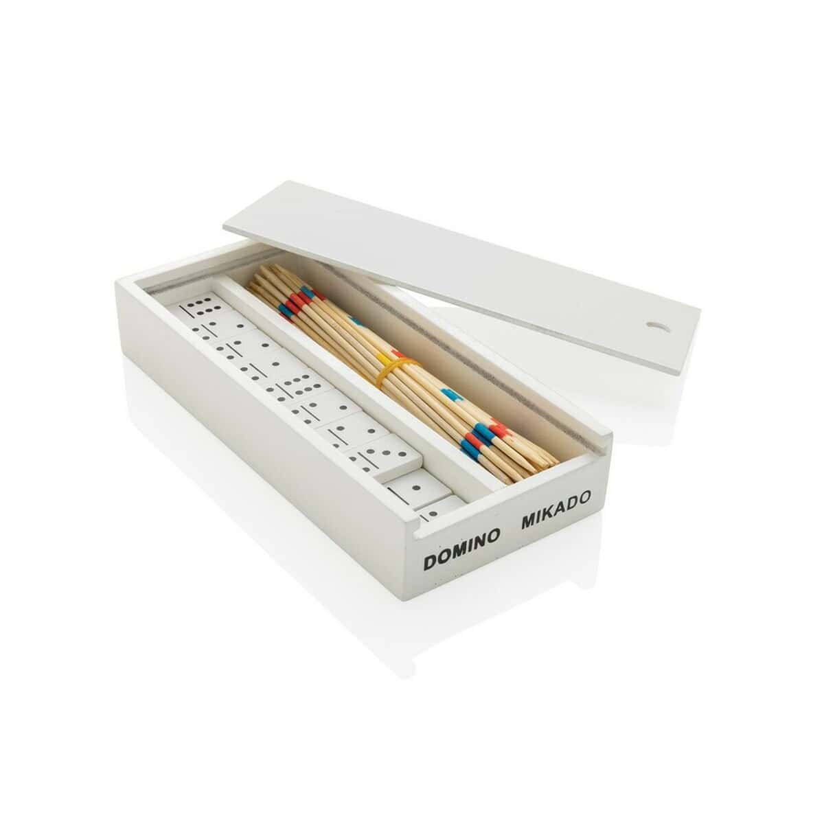 Zestaw gier, mikado i domino to prawdziwa perełka wśród upominków firmowych, łącząca w sobie tradycję, ekologię i funkcjonalność. W drewnianym pudełku o wymiarach 20 x 9,2 x 3,3 cm kryją się aż 41 elementów mikado oraz 28 elementów domino, co pozwala cieszyć się dwiema kultowymi grami w jednym kompaktowym zestawie. Całość wykonano z solidnego mdf pokrytego eleganckim, białym lakierem, a zarówno gry, jak i pudełko posiadają certyfikat FSC®, gwarantujący odpowiedzialne pozyskiwanie drewna. Dodatkową wartością jest niski ślad węglowy produktu: 0,78 kg CO₂, co czyni ten przedmiot doskonałym wyborem dla marek stawiających na zrównoważony rozwój 🙂.