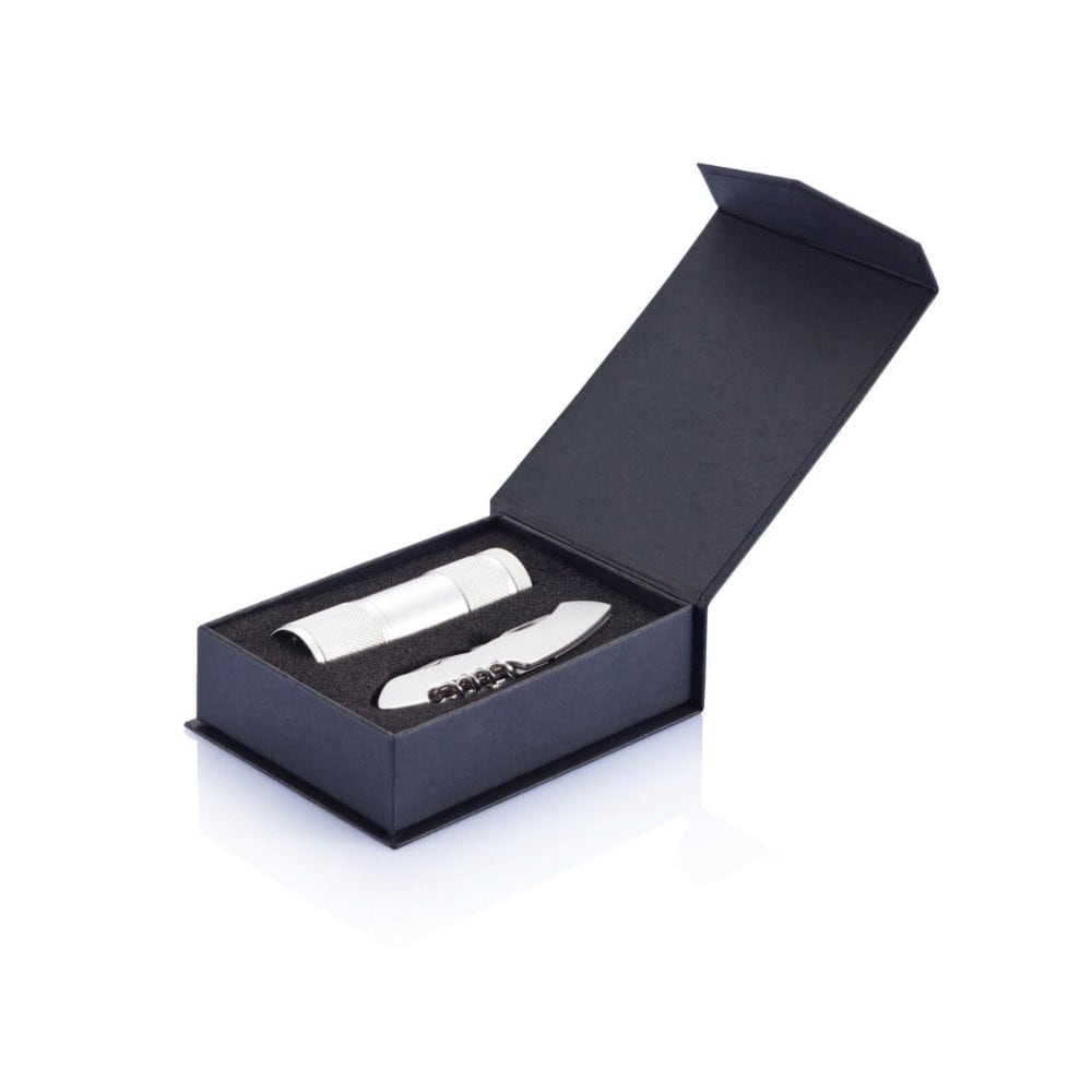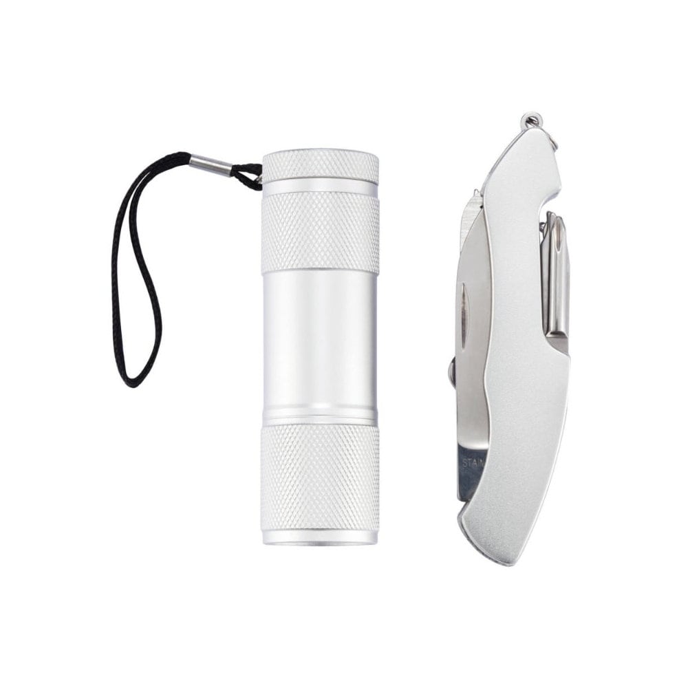 Ten zestaw narzędzi z latarką i scyzorykiem to idealne rozwiązanie dla każdego, kto lubi być przygotowany na wszystko. Wykonany z matowego, anodyzowanego aluminium, wyposażony w 13 funkcji: duże ostrze, piłka, obrzynak do ryb, obcinak do paznokci, nożyczki, otwieracz do butelek, płaski śrubokręt, otwieracz do puszek, korkociąg, śrubokręt krzyżowy, małe ostrze, pilnik do paznokci i szydło, jest idealnym narzędziem do domu, biura, samochodu lub na wszystkie wyprawy.