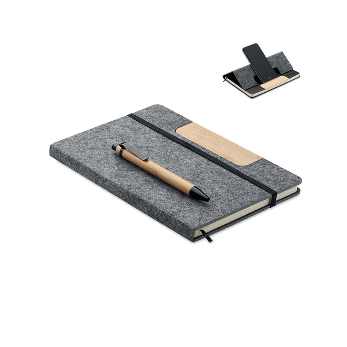 O wyjątkowości produktu decyduje innowacyjna funkcja podstawki na telefon, która pozwala wygodnie prowadzić wideokonferencje lub korzystać z aplikacji notatnikowych bez konieczności odrywania rąk od kartki. W zestawie znajduje się również długopis z bambusowym korpusem i niebieskim tuszem – naturalny akcent świetnie współgrający z ekologiczną filozofią całego kompletu. Elastyczny pasek zamykający, wstążkowa zakładka i dostępność w klasycznych kolorach szarym oraz czarnym sprawiają, że notatnik prezentuje się profesjonalnie w każdej sytuacji.