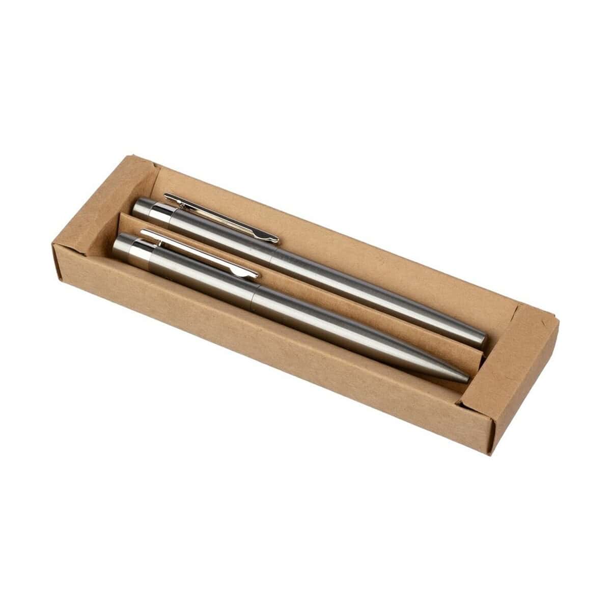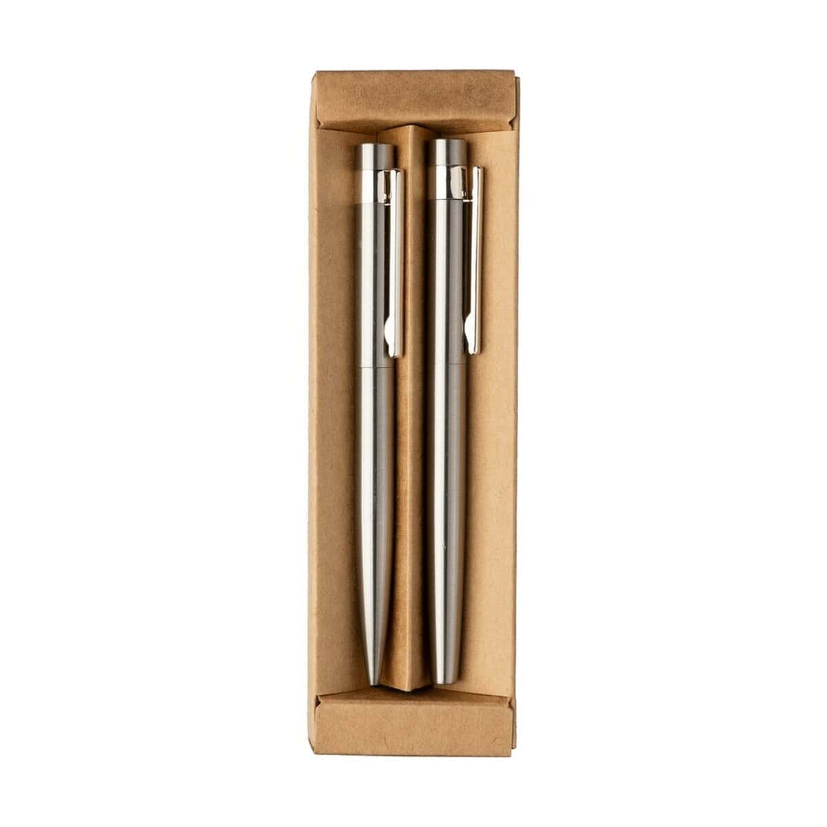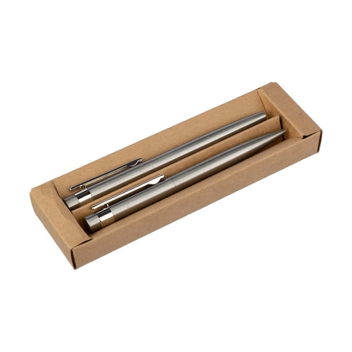 Zestaw piśmienniczy, długopis i pióro kulkowe to znakomite połączenie elegancji z ekologią, które wyniesie wizerunek Twojej marki na wyższy poziom 🙂. Oba instrumenty wykonano ze stali nierdzewnej z recyklingu, co podkreśla troskę o środowisko, a jednocześnie gwarantuje trwałość i prestiżowy wygląd. Wkłady w barwie niebieskiej zapewniają płynne, równomierne pismo, a mechanizm przekręcany długopisu działa pewnie i bez zacięć. Całość zapakowana jest w estetyczne pudełko z papieru kraftowego, nadające kompletowi szlachetny charakter upominku.