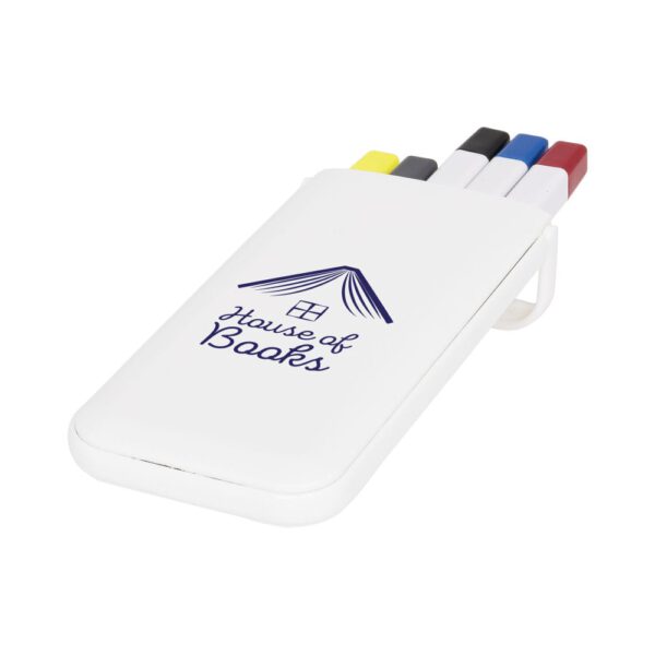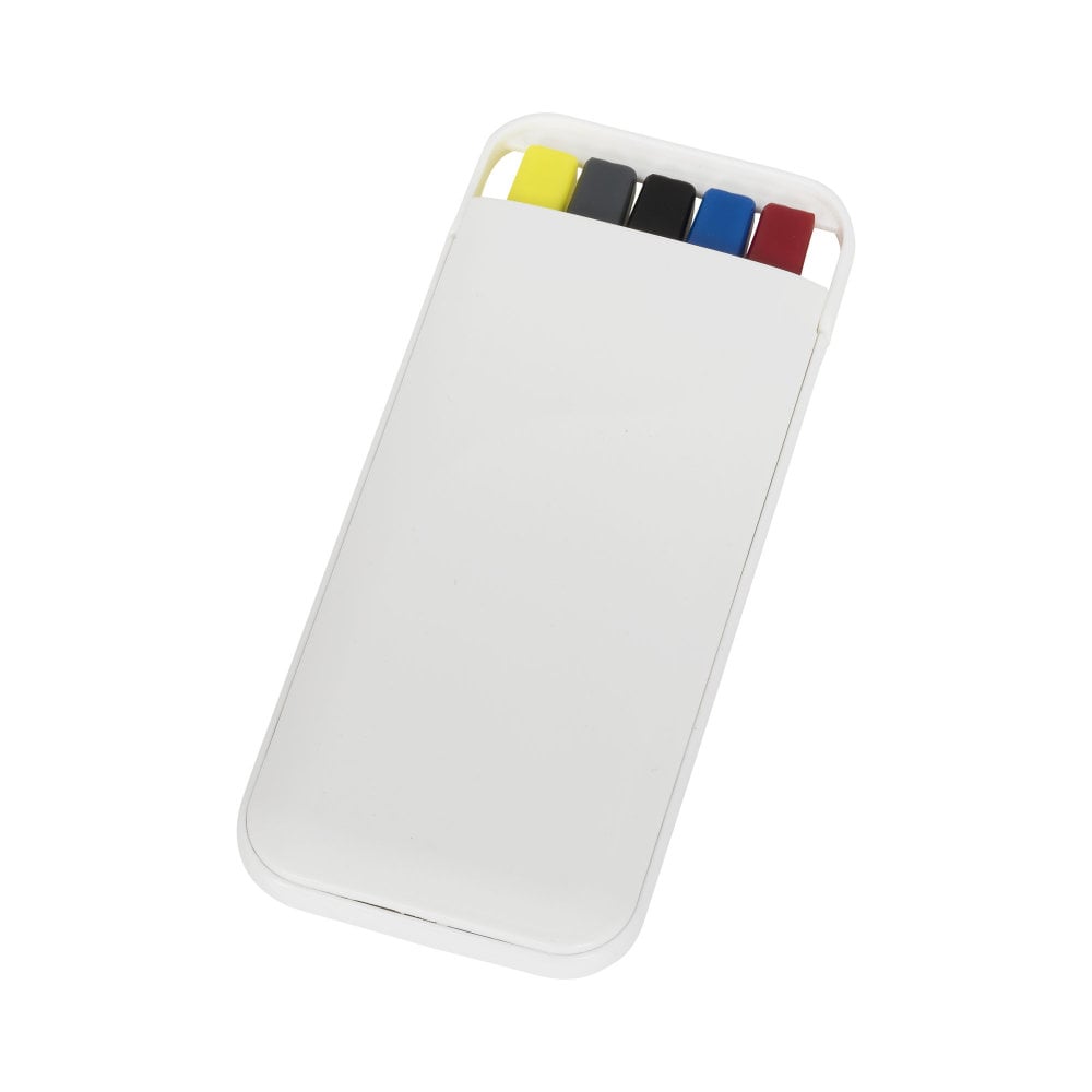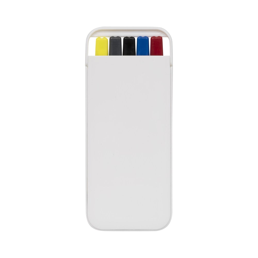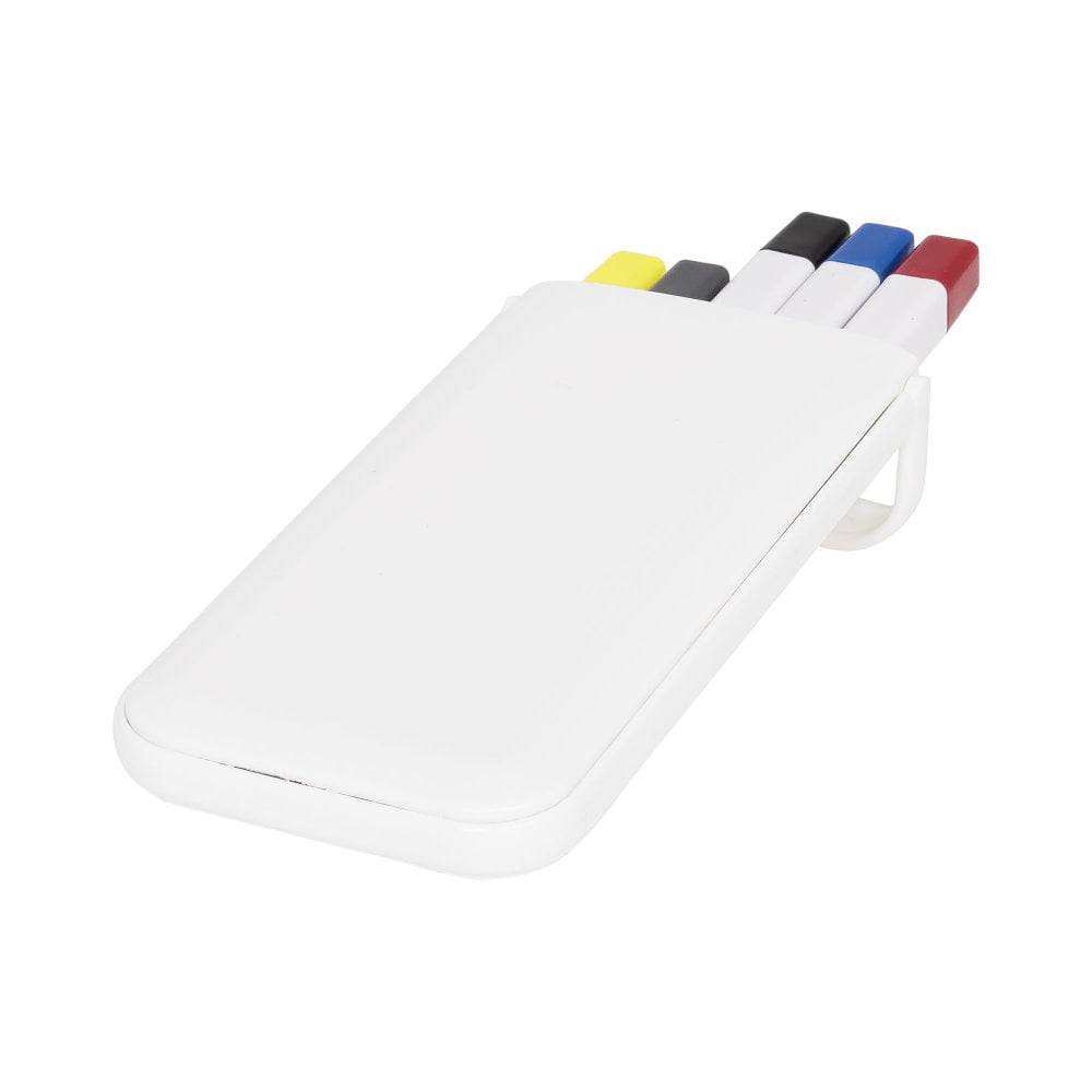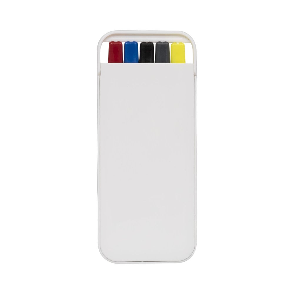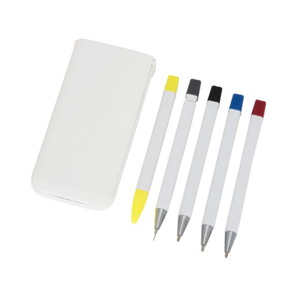 Etui zawierające trzy długopisy, ołówek oraz zakreślacz to doskonałe rozwiązanie dla osób, które potrzebują wszystkiego w jednym miejscu. Elegancko wykończone w białym kolorze, jest wystarczająco duże, aby pomieścić wszystkie przybory oraz wygodne, aby z łatwością zabrać je ze sobą wszędzie. Długopisy w różnych kolorach idealnie sprawdzą się do oznaczania lub zaznaczania, a zakreślacz pomoże szybko i precyzyjnie wytyczyć linie. Ołówek jest idealny do sporządzania szczegółowych notatek lub rysunków.