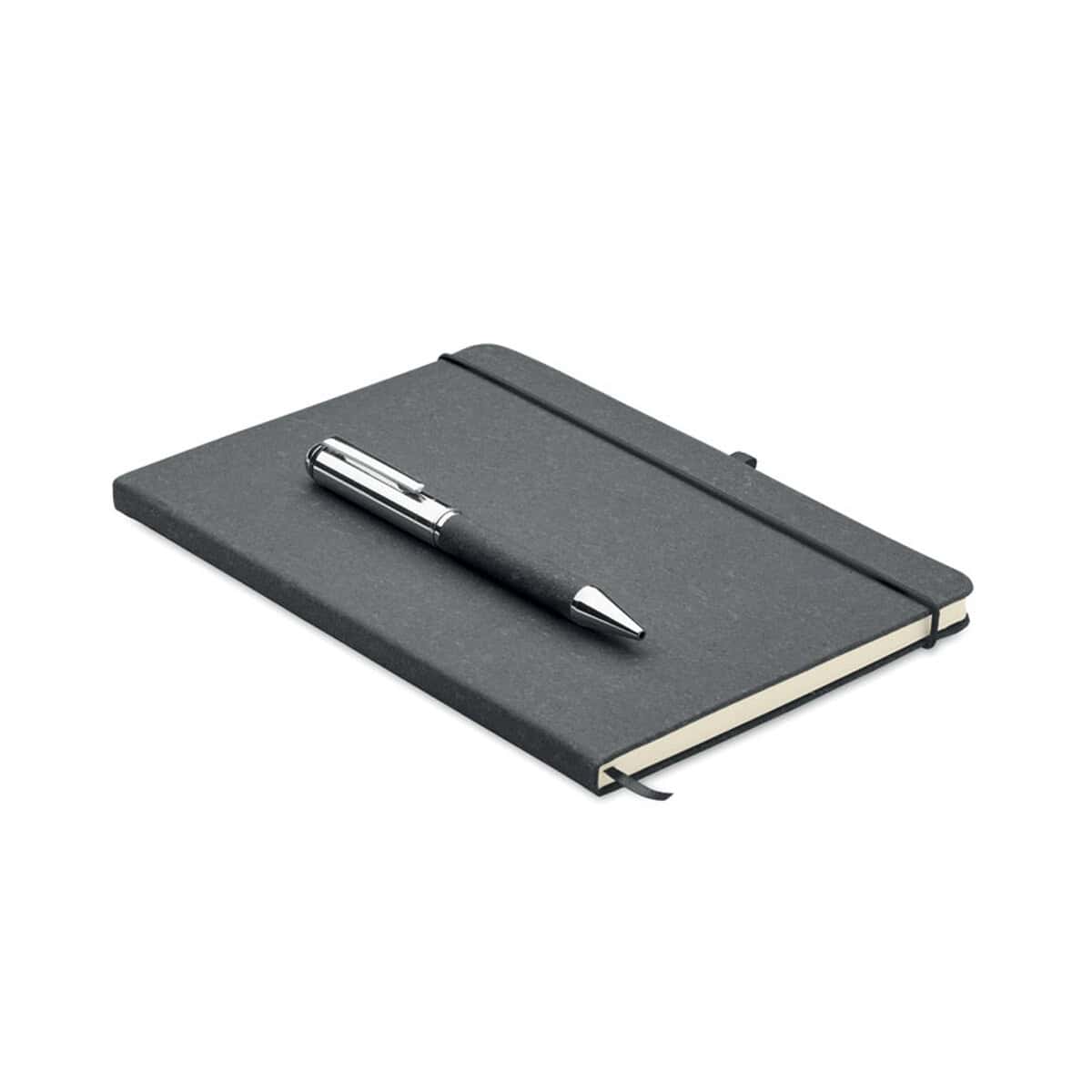 Zestaw skórzanych notatników ELEGANOTE to wyśmienity prezent, który łączy elegancję z ekologiczną świadomością 😊. Wykonany w 75 % z recyklingowanej skóry i papieru, zachwyca nie tylko wyglądem, lecz także odpowiedzialnym podejściem do środowiska. Zestaw składa się z notatnika A5 o twardej okładce i dopasowanego metalowego długopisu z niebieskim tuszem. 160 stron w linie (80 kartek) z papieru z recyklingu, wygodna gumka zamykająca, wstążkowy znacznik oraz uchwyt na długopis sprawiają, że to gadżet zarówno praktyczny, jak i reprezentacyjny. Całość mieści się w stylowym papierowym pudełku, które od razu podkreśla jego premium — wymiary 24 × 1,6 × 19,4 cm i waga 0,38 kg dowodzą solidności wykonania.