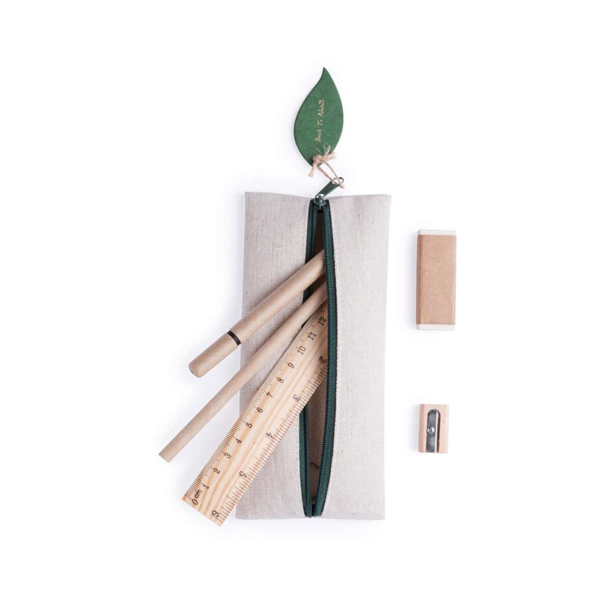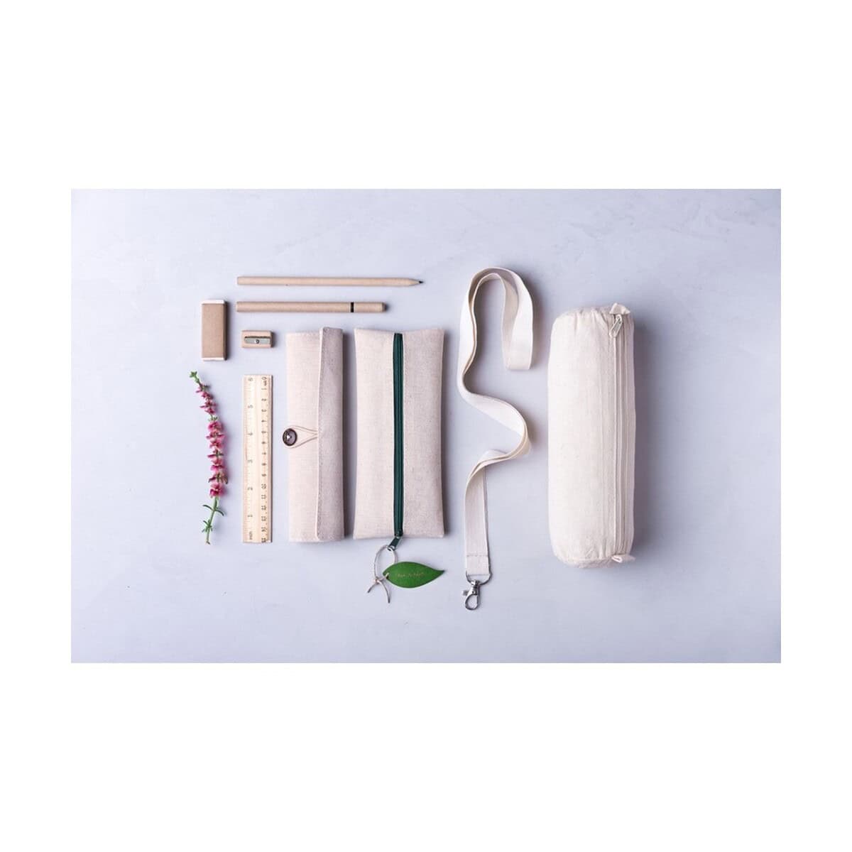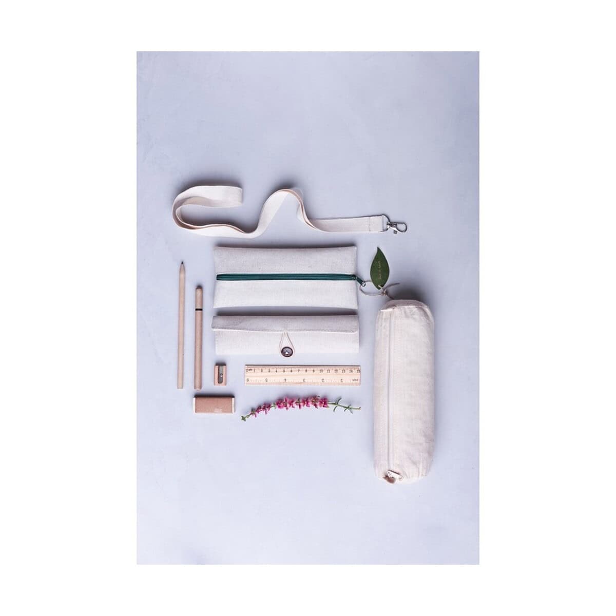 Zestaw szkolny, piórnik, ołówek, długopis, linijka, gumka i temperówka to prawdziwy must-have każdego ucznia i miłośnika kreacji na papierze 😊. W kompaktowym piórniku zapinanym na zamek błyskawiczny znajdziesz ołówek z naturalnego drewna, długopis z niebieskim wkładem, precyzyjną linijkę 15 cm / 6 cali, miękką gumkę oraz praktyczną temperówkę. Całość wykonano z przyjaznych środowisku materiałów: juta, bawełna, dzięki czemu zestaw wpisuje się w aktualne trendy eko. Wymiary piórnika to 19 × 8,5 cm, więc bez trudu zmieści się w szkolnym plecaku czy torbie na uczelnię. 🎒