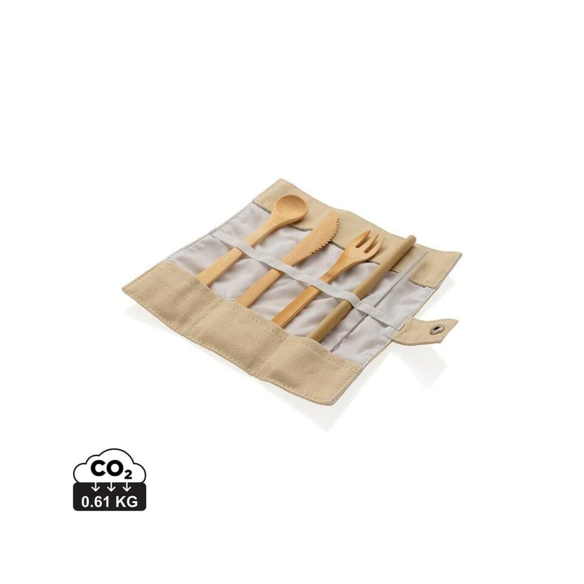Zestaw sztućców bambusowych wielokrotnego użytku, 4 el. to ekologiczny gadżet 🌿, który łączy styl i praktyczność, stając się atrakcyjnym nośnikiem logo dla Twojej firmy. W komplecie znajdują się cztery elementy: łyżka, widelec, nóż oraz słomka z czyścikiem, schowane w eleganckim pokrowcu. Dzięki temu zestawowi Twoi klienci poczują się wyróżnieni, jednocześnie wspierając ochronę środowiska – ślad węglowy 0,61 kg CO₂ udowadnia, że produkt jest przyjazny planetom 😊.