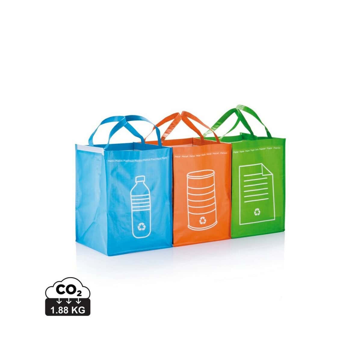 Zestaw toreb do segregacji odpadów, 3 el. to znakomity sposób, aby połączyć dbałość o środowisko z wyrazistą promocją marki. Każda torba przeznaczona jest na inny rodzaj surowców – metal, papier i plastik – dzięki czemu domowa lub biurowa segregacja staje się prostsza i bardziej efektywna 🙂. Wykonane z wytrzymałej tkaniny PP woven, torby są lekkie, a jednocześnie odporne na uszkodzenia, co sprawia, że służą przez długi czas jako praktyczny gadżet reklamowy.