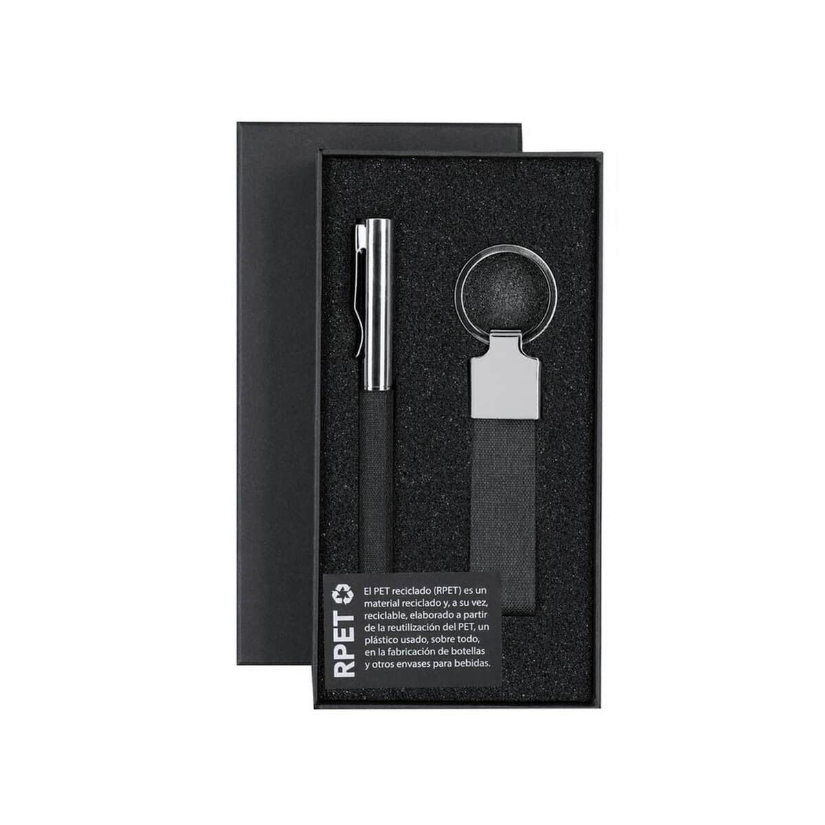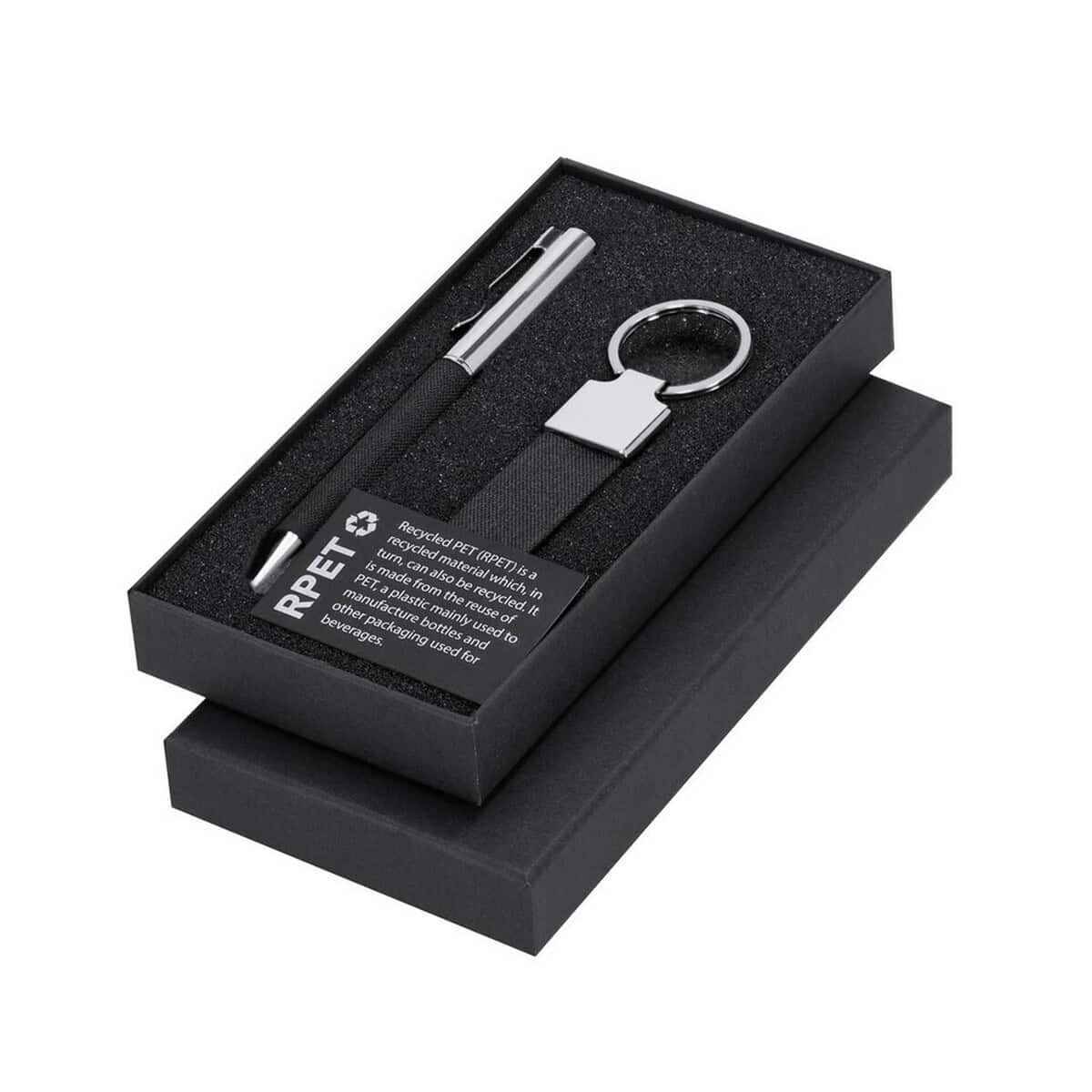 Zestaw upominkowy, brelok, długopis, pudełko podarunkowe to wyjątkowy gadżet, który przyciąga uwagę elegancją i ekologicznym charakterem 🙂 Dzięki wykonaniu z materiału RPET 300D oraz metalu stanowi świadomy wybór dla Twojej firmy, podkreślając troskę o środowisko i wysoki standard wizualny. W schludnym, całkowicie czarnym zestawie znajdziesz metalowy długopis z wkładem w kolorze niebieskim oraz solidny brelok – oba elementy gładkie i idealne pod nadruk lub trwałe grawerowanie. Zewnętrzne czarne pudełko podarunkowe o wymiarach 17,3 × 2,5 × 9,1 cm mieści się w każdej teczce i walizce, a niewielka waga zaledwie 115 g ułatwia dystrybucję na targach i konferencjach. 🎁