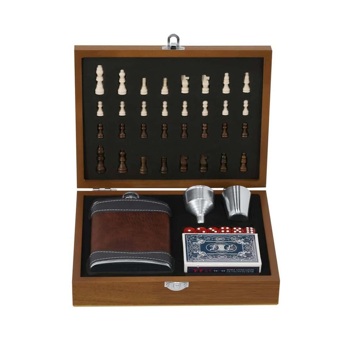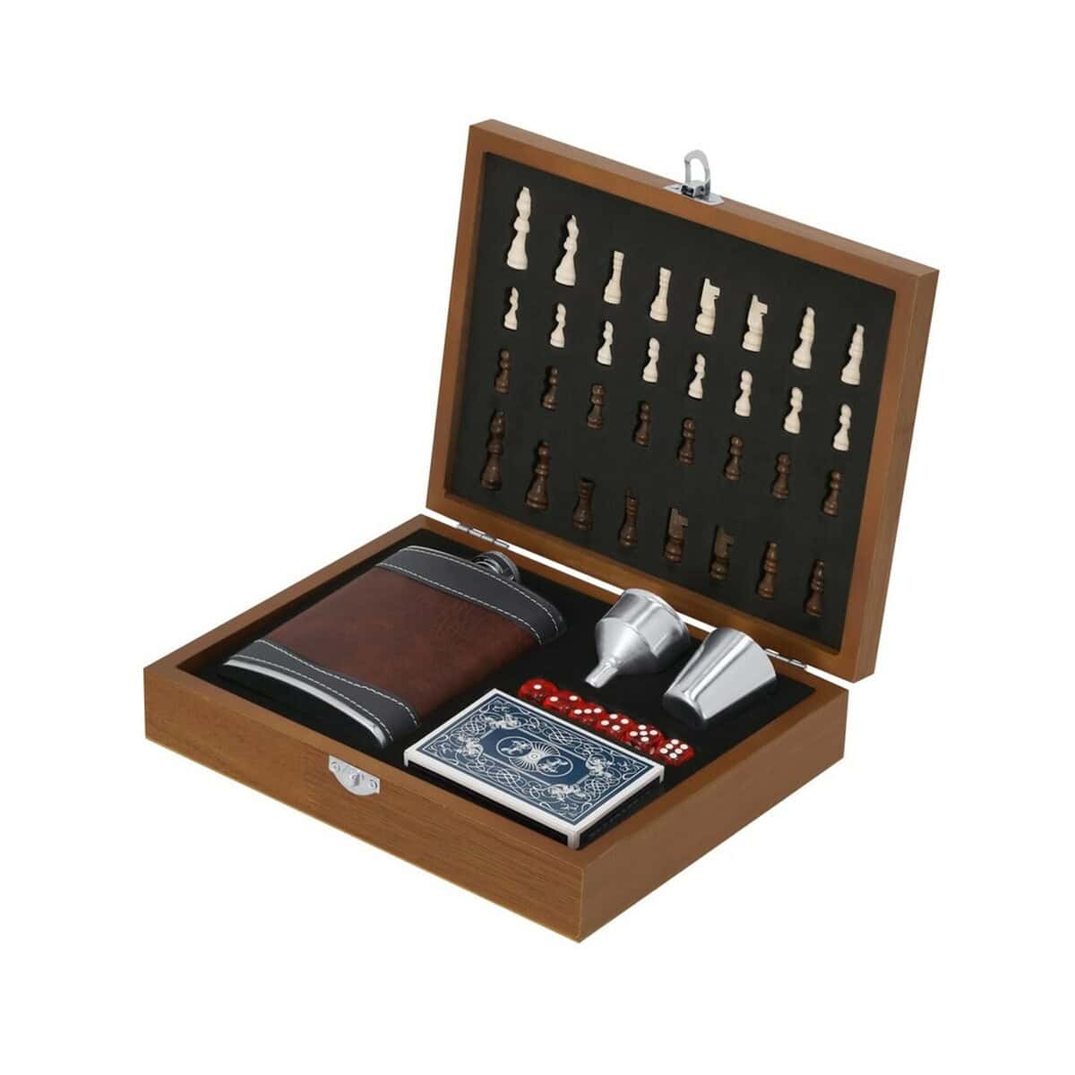 Zestaw upominkowy, piersiówka 175 ml, kieliszek 30 ml, szachy, karty oraz kości do gry
