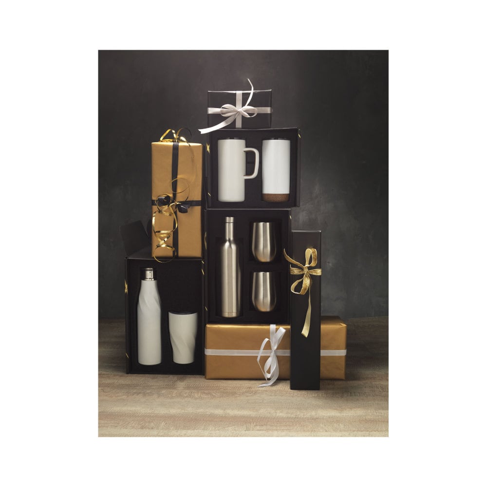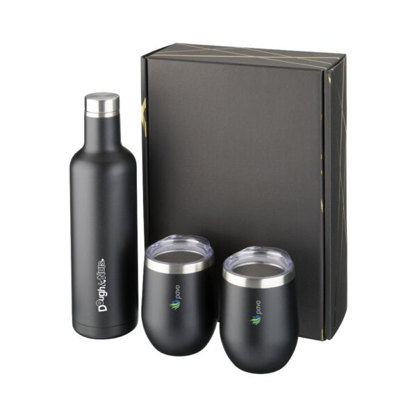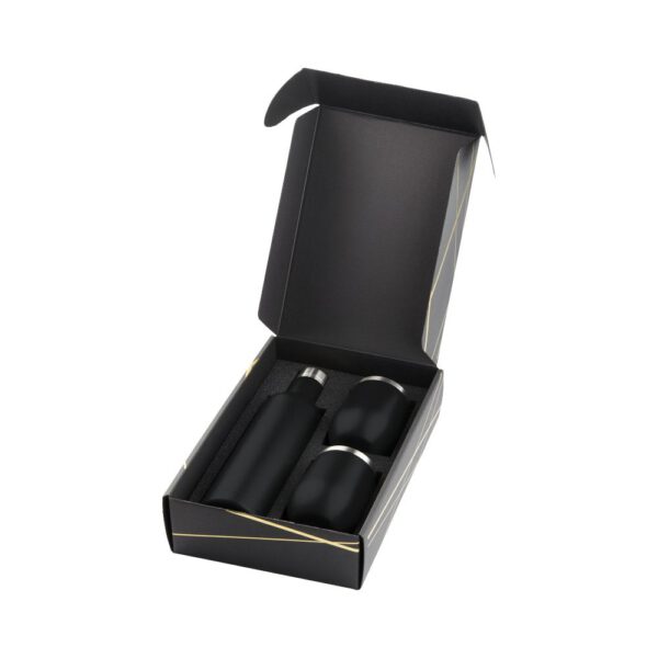 Ten zestaw upominkowy z pewnością zachwyci wszystkich miłośników zdrowego stylu życia. Składa się on z miedzianej izolowanej próżniowo butelki Pinto o pojemności 750 ml oraz dwóch miedzianych izolowanych próżniowo kubków Corzo o pojemności 350 ml. Zestaw dodatkowo zapakowany jest w estetyczne czarne pudełko upominkowe z błyszczącymi złotymi detalami. Przedmioty wykonane są z wysokiej jakości materiałów, dzięki czemu cechują się one nie tylko pięknym designem, ale i trwałością. Zestaw idealnie sprawdzi się w roli prezentu dla bliskiej osoby.