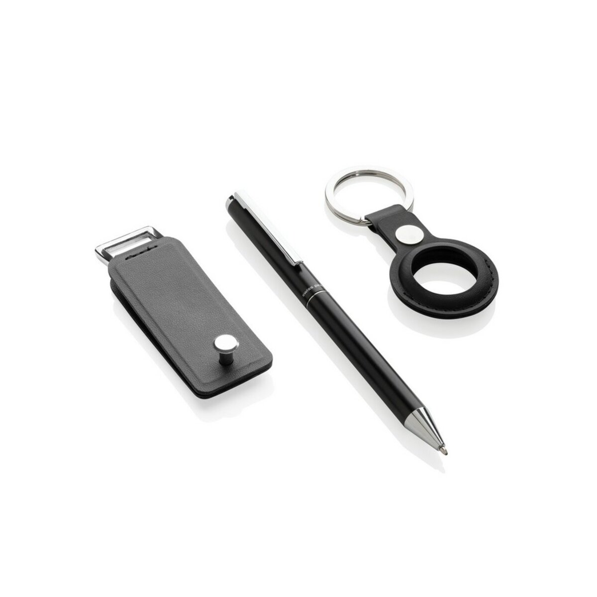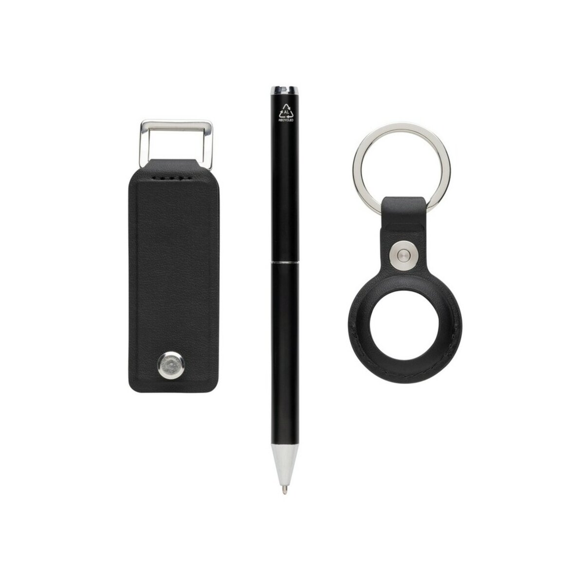 Ten perfekcyjny zestaw upominkowy jest zbudowany z materiałów przyjaznych dla środowiska. Brelok, organizer i długopis wykonano z PU oraz aluminium z recyklingu, co potwierdza certyfikat RCS. Troska o detale i wykończenie w kolorze czarnym dodaje produktom elegancji i uniwersalności.