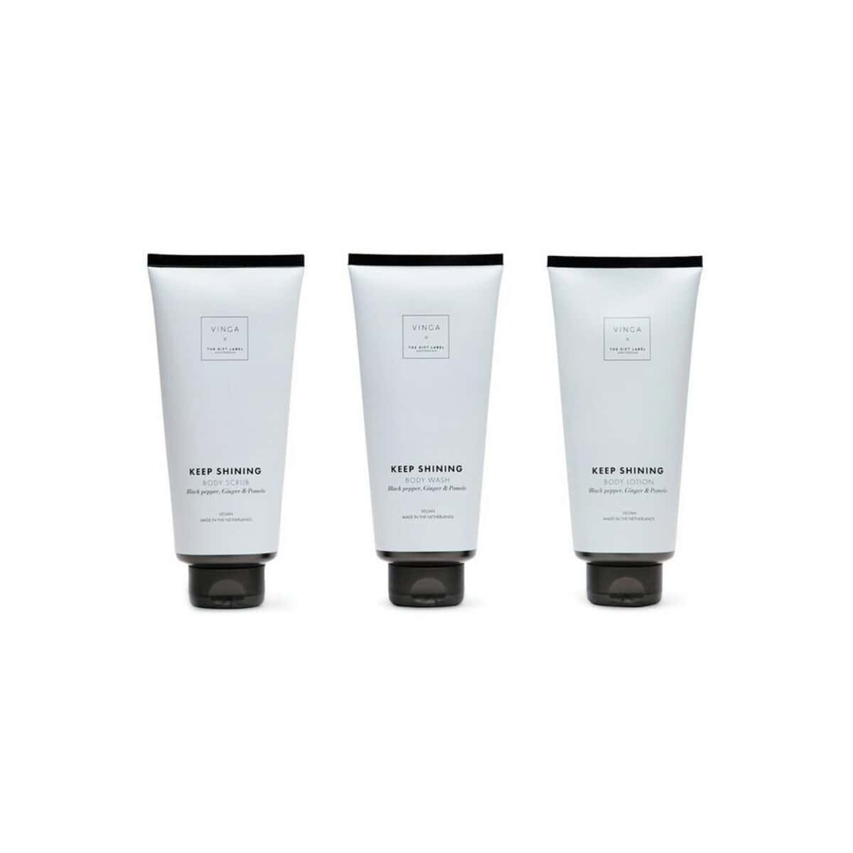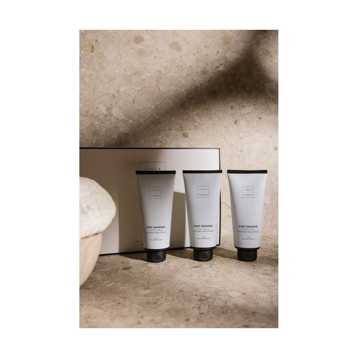 Zestaw upominkowy VINGA x TGL to znakomity sposób, by obdarować kontrahentów lub pracowników czymś więcej niż zwykłym kosmetykiem. W eleganckim pudełku prezentowym kryją się trzy starannie dobrane produkty: żel do mycia ciała 200 ml, balsam do ciała 200 ml oraz peeling 200 ml. Ich ciepły aromat czarnego pieprzu, imbiru i pomelo tworzy przyjemnie pobudzającą kompozycję, która zamienia każdą kąpiel w chwilę relaksu. Wyjątkowy design opakowania – utrzymany w ponadczasowych barwach bieli i czerni – doskonale współgra z nowoczesnym materiałem rPET, podkreślając ekologiczne wartości firmy. Wymiary 30,9 × 6,5 × 21,9 cm sprawiają, że całość prezentuje się solidnie i luksusowo, a jednocześnie pozostaje poręczna 🎁.