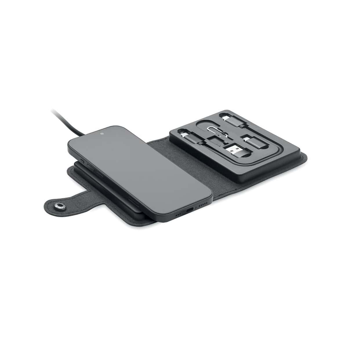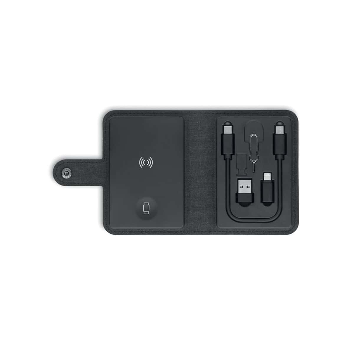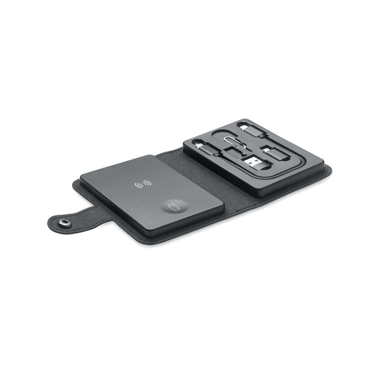 Zestaw złączy kablowych 4 w 1 1 CAWATT to nowoczesny, wielozadaniowy gadżet stworzony z myślą o najbardziej wymagających użytkownikach urządzeń mobilnych. W eleganckiej, matowej obudowie o barwie czarnej skrywa się ładowarka bezprzewodowa 15 W, specjalny moduł do zegarka Apple® oraz kabel ładujący 4 w 1 z poręcznym narzędziem do wysuwania kart SIM. Dzięki wymiarom 11 × 8,3 × 2,7 cm i masie zaledwie 0,125 kg zestaw mieści się w każdym plecaku czy torebce, a jednocześnie robi wrażenie solidnością – wykonano go z PU i RPET z recyklingu, plastiku ABS z recyklingu oraz aluminiowej płyty pochodzącej z recyklingu 😊